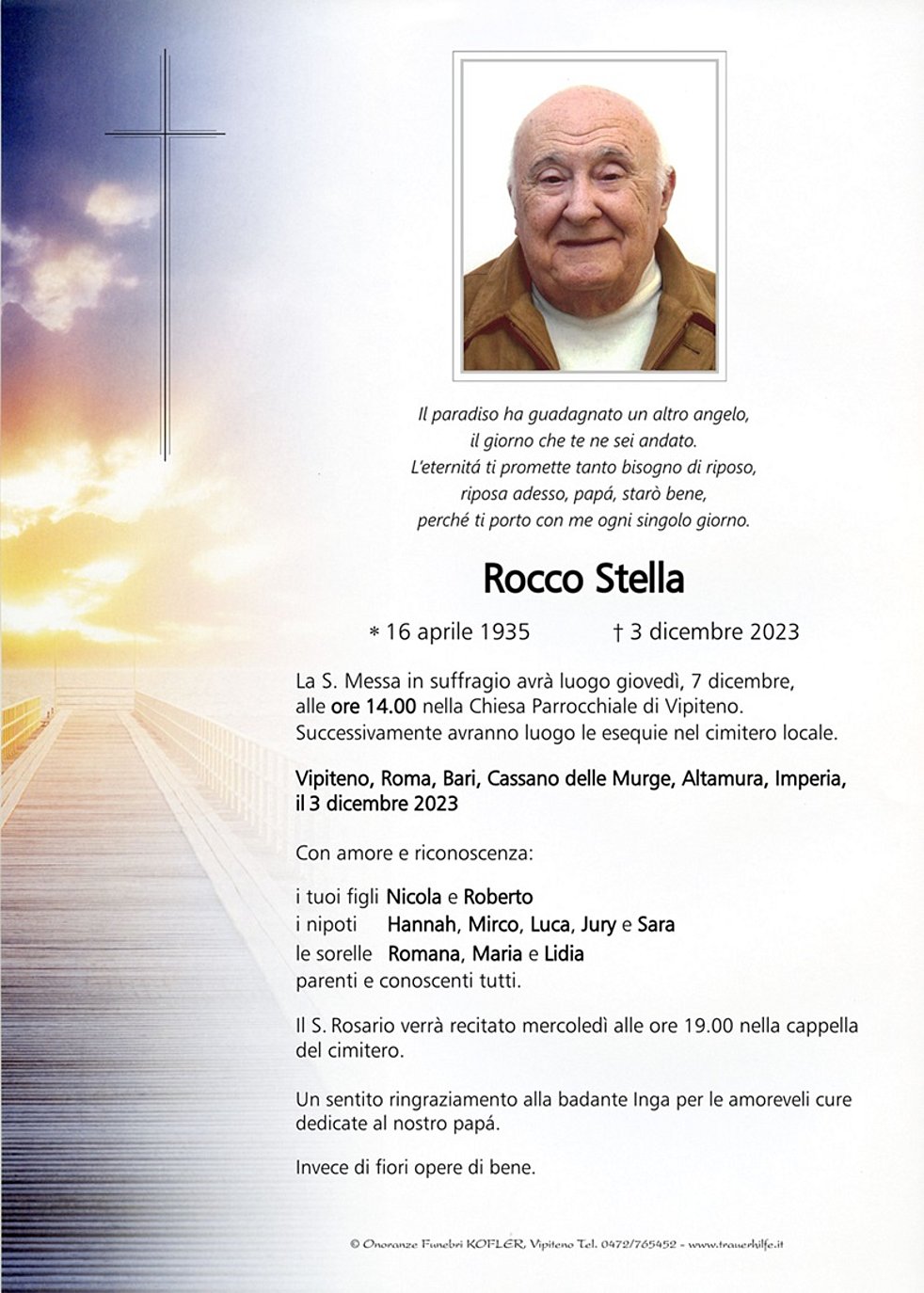 La S. Messa in suffragio avrà luogo giovedì, 7 dicembre, alle ore 14.00 nella Chiesa Parrocchiale di Vipiteno. Successivamente avranno luogo le esequie nel cimitero locale.
