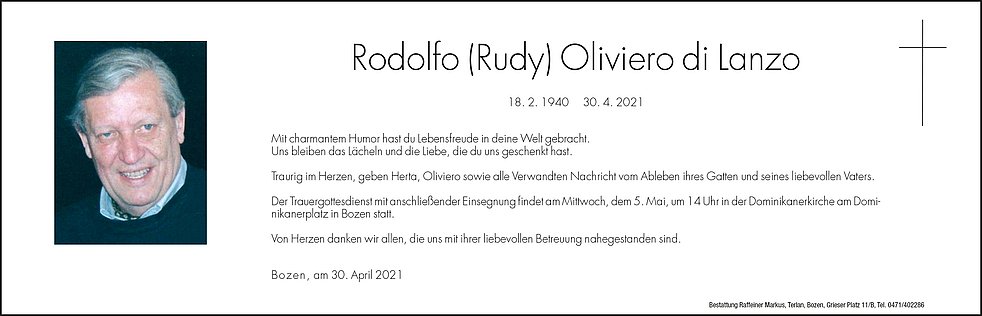 Traurig im Herzen geben Herta, Oliviero sowie alle Verwandten Nachricht vom Ableben ihres Gatten und seines liebevollen Vaters.