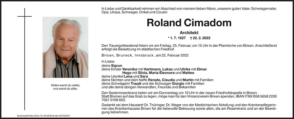 Den Trauergottesdienst feiern wir am Freitag, 25. Februar, um 15 Uhr in der Pfarrkirche von Brixen. Anschließend erfolgt die Beisetzung im städtischen Friedhof.
