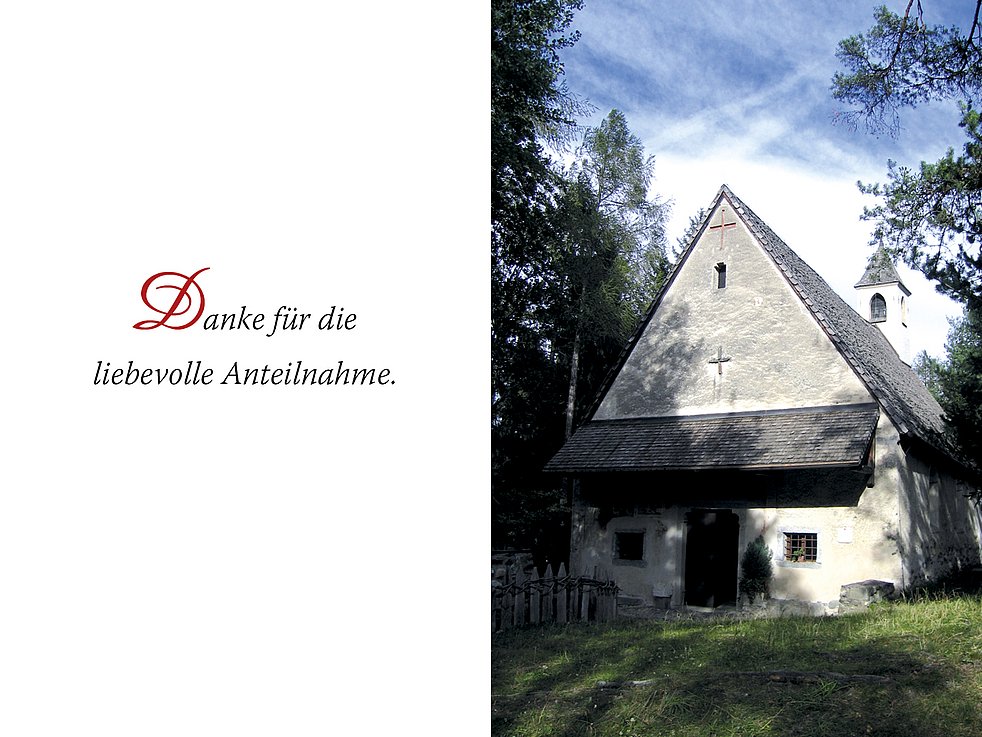 Gedankt sei dem Hausarzt Dr. Thüringer, Dr. Weger der Medizinischen Abteilung und den Krankenpflegerinnen des Krankenhauses Brixen für die liebevollen Betreuung sowie allen, die am Rosenkranz und an der Beerdigung teilnehmen.