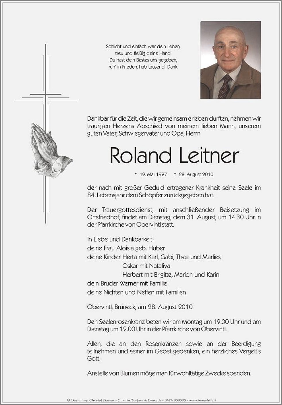 Der Trauergottesdienst, mit anschließender Beisetzung im Ortsfriedhof, findet am Dienstag, dem 31. August, um 14.30 Uhr in der Pfarrkirche von Obervintl statt.
