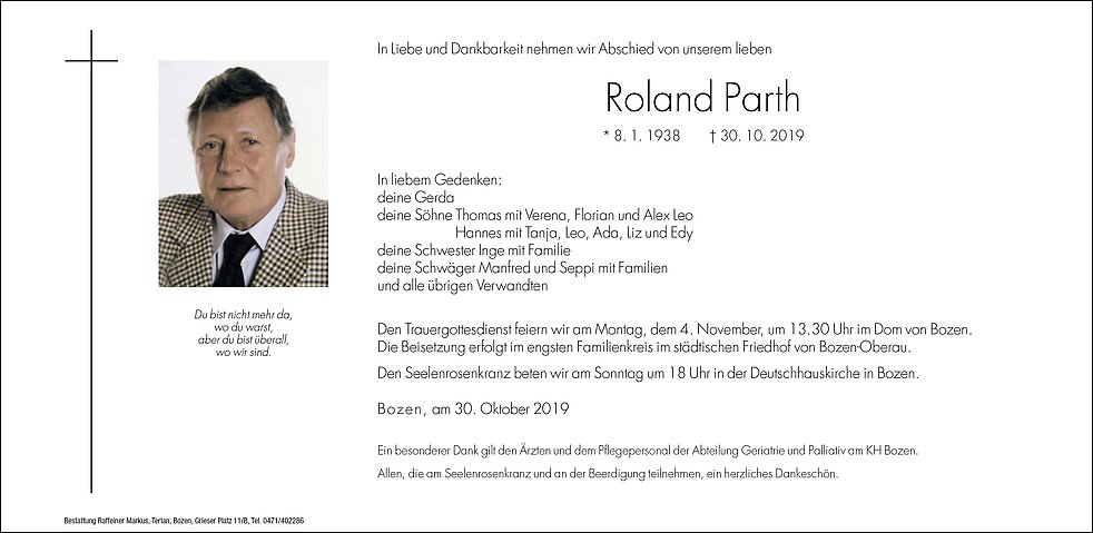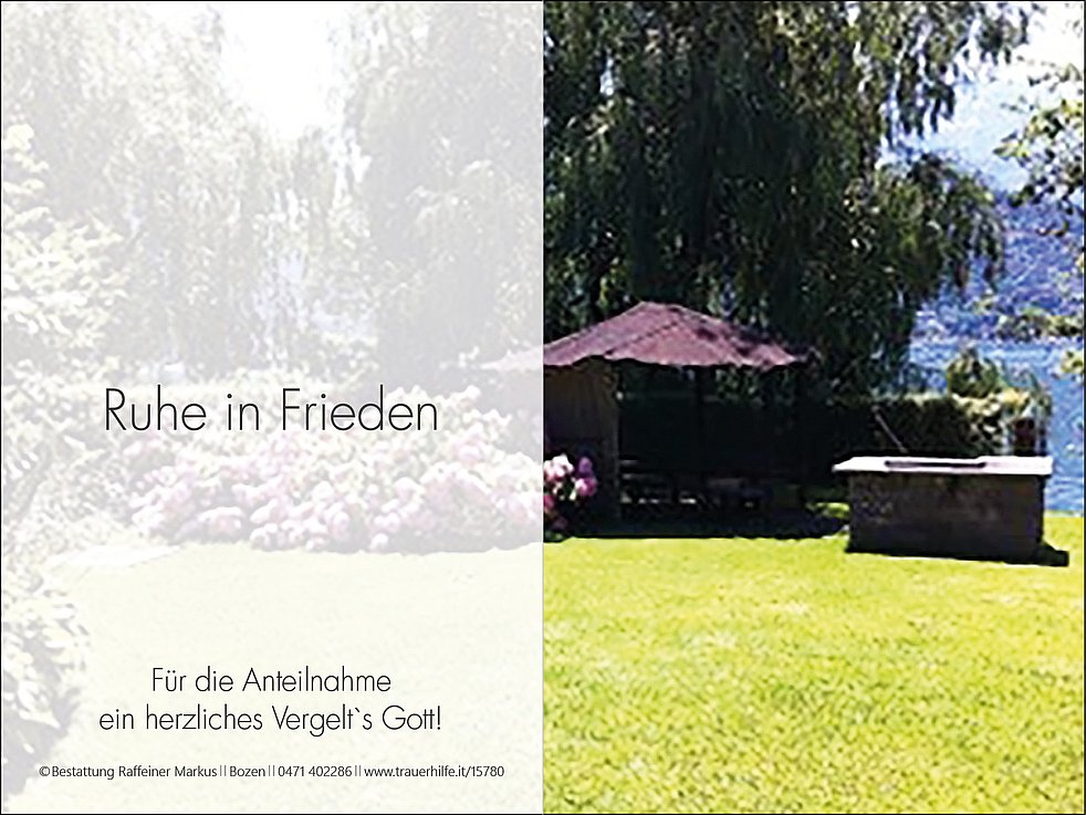 Den Trauergottesdienst feiern wir am Montag, dem 4. November, um 13.30 Uhr im Dom von Bozen. Die Beisetzung erfolgt im engsten Familienkreis im städtischen Friedhof von Bozen-Oberau.