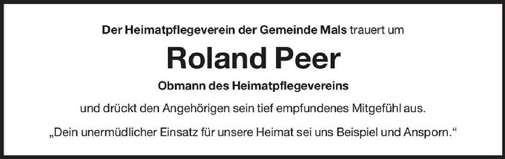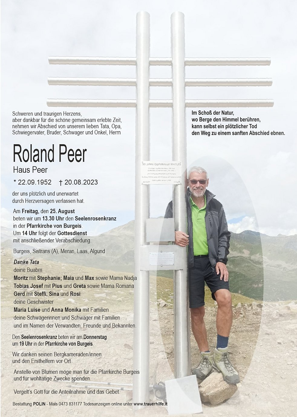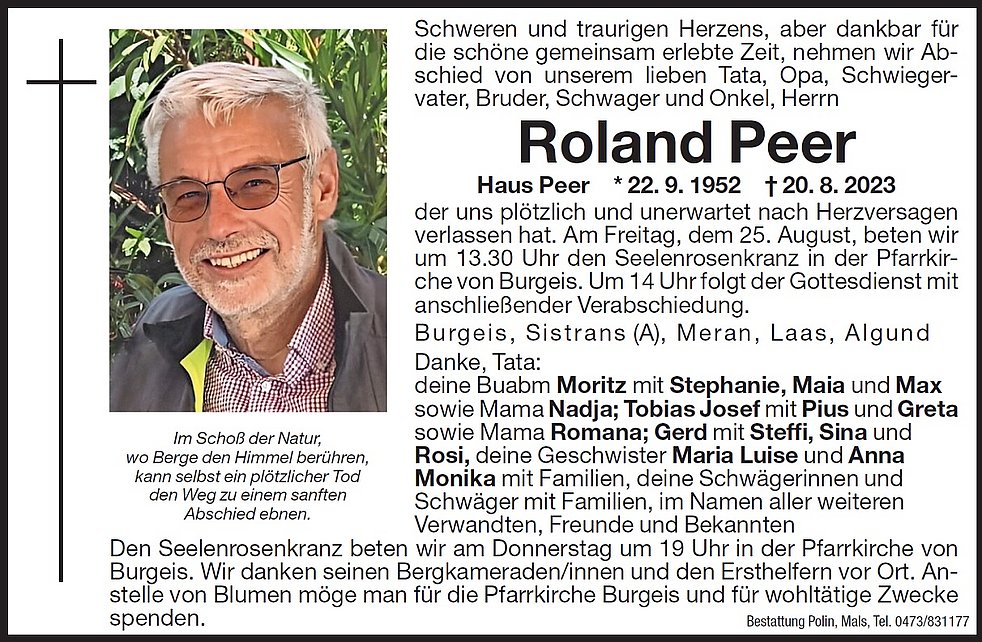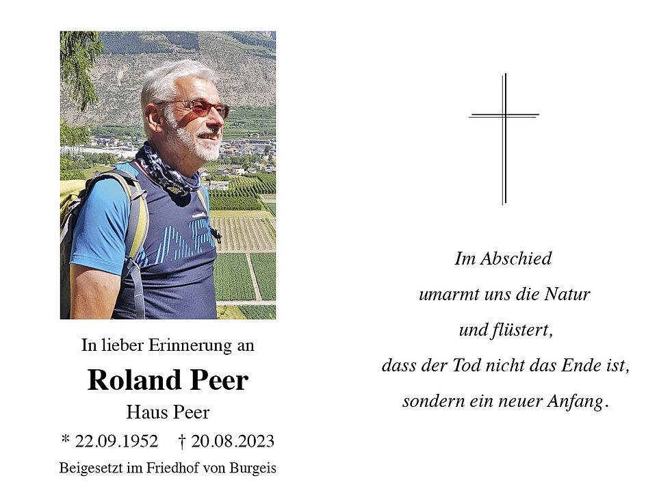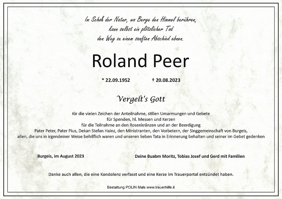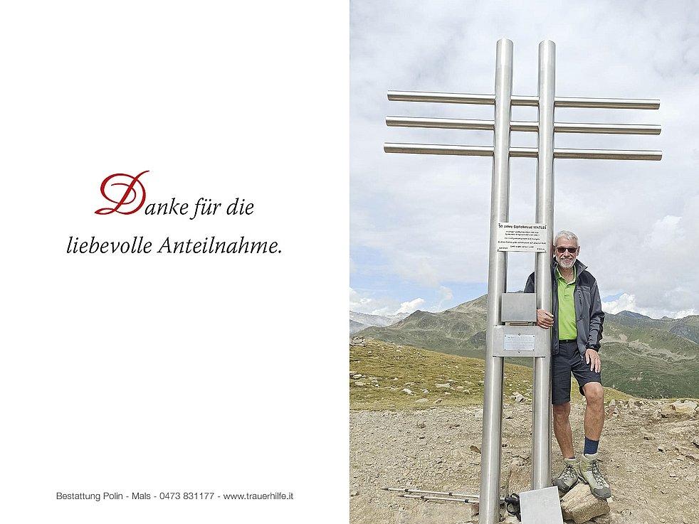 Anstelle von Blumen möge man für die Pfarrkirche Burgeis und für wohltätige Zwecke spenden.
