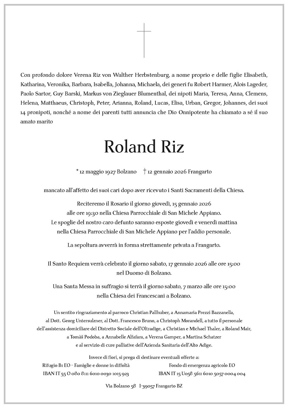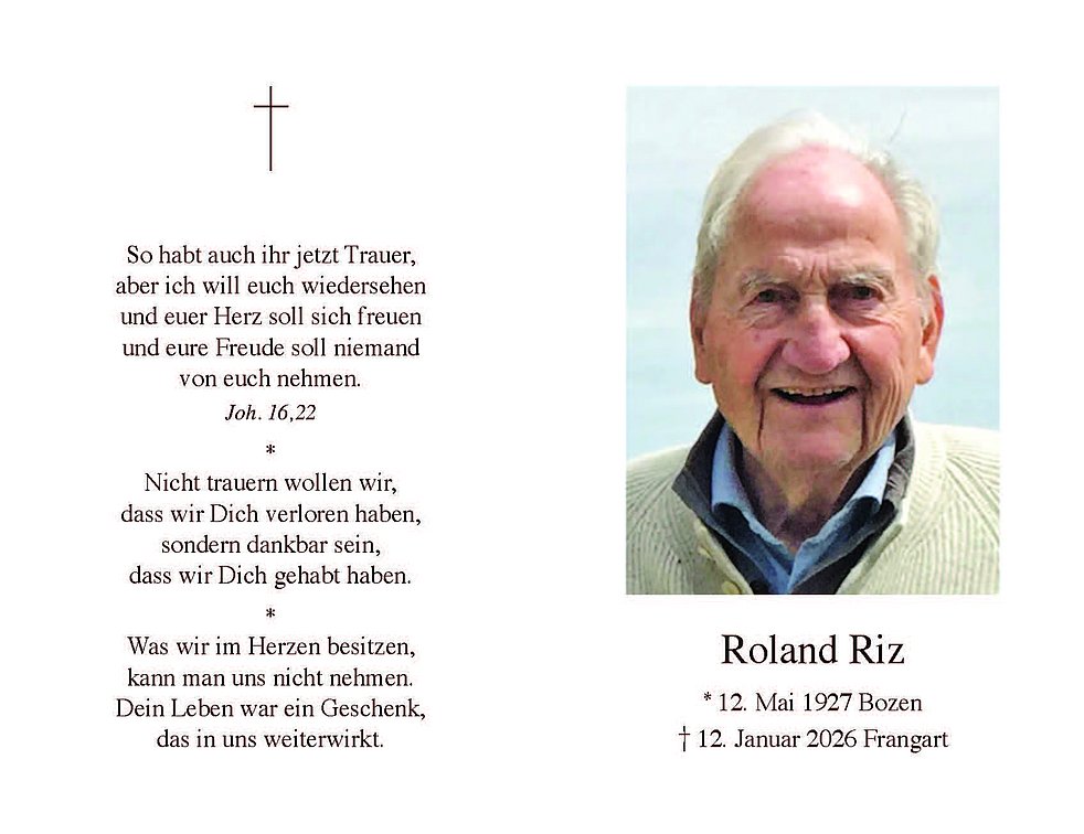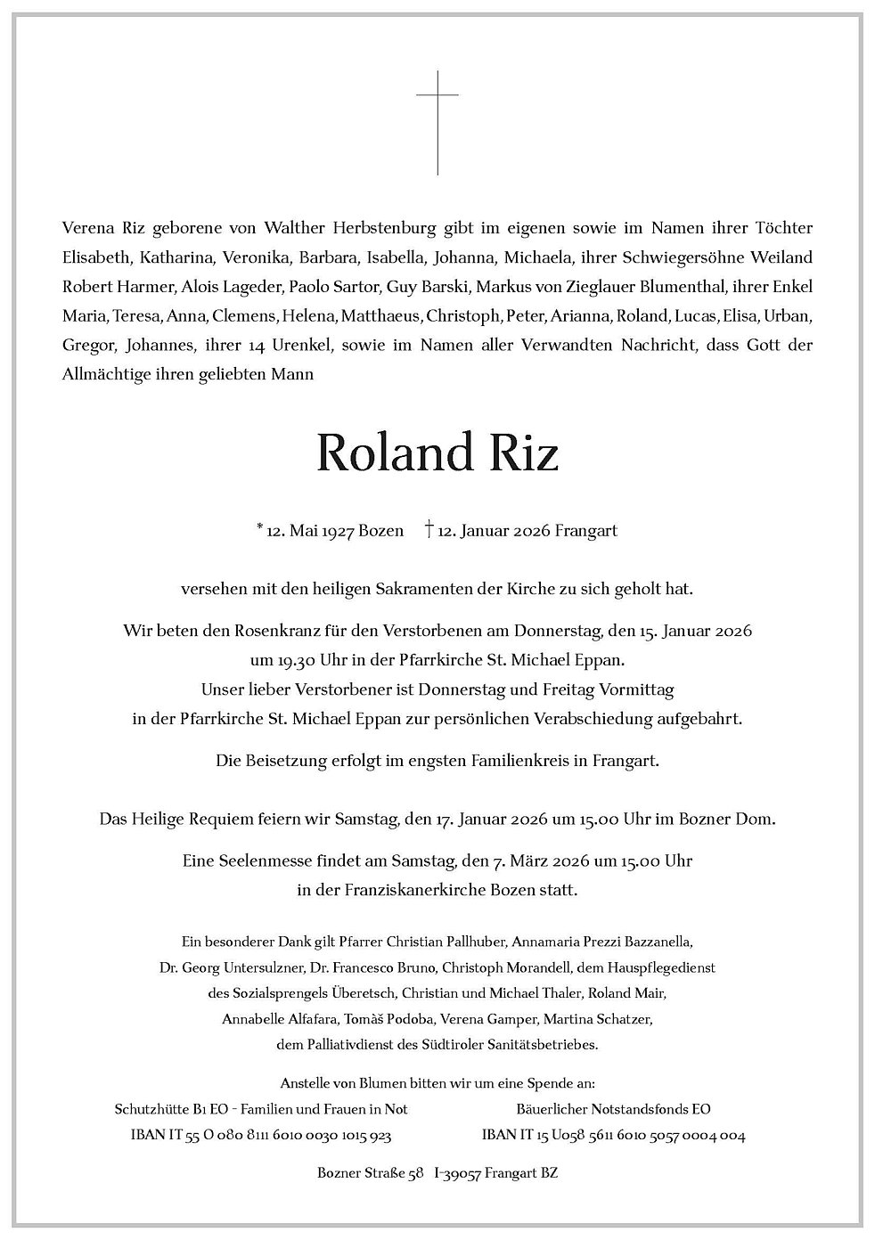Begräbnisgottesdienst: 16.01. - 14:30 Uhr Pfarrkirche Frangart