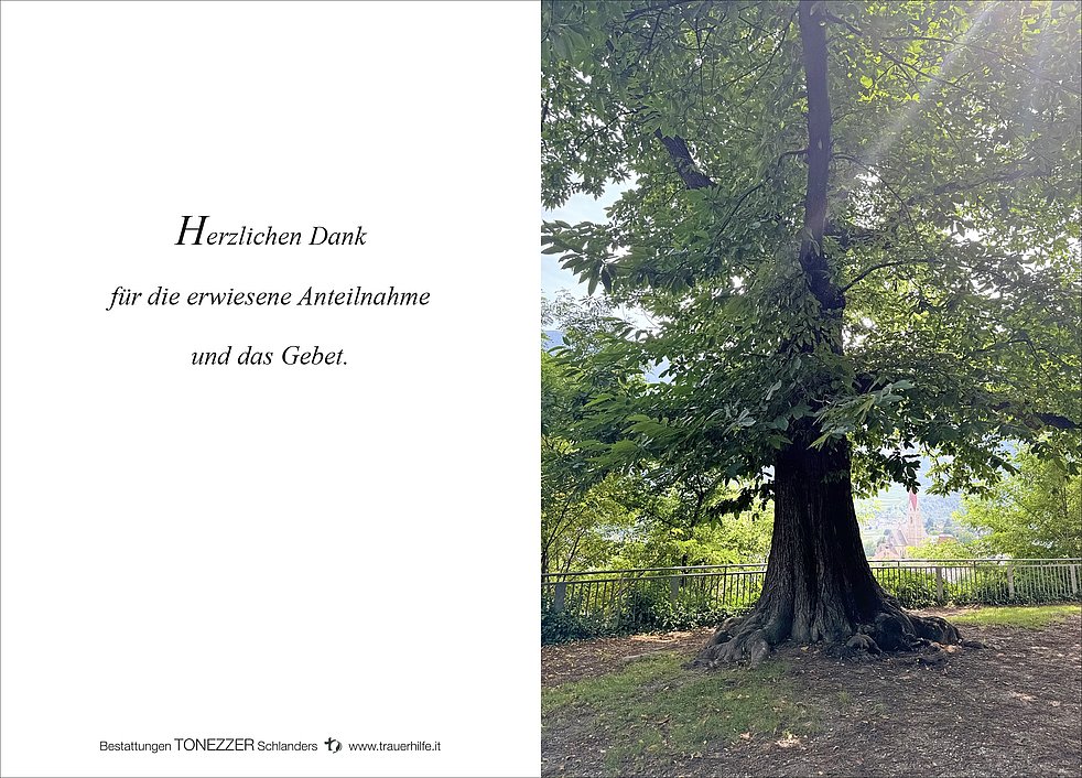 Den Begräbnisgottesdienst mit anschließender Urnenbeisetzung feiern wir am Montag, 22. Juli, um 14 Uhr in der Pfarrkirche von Schlanders