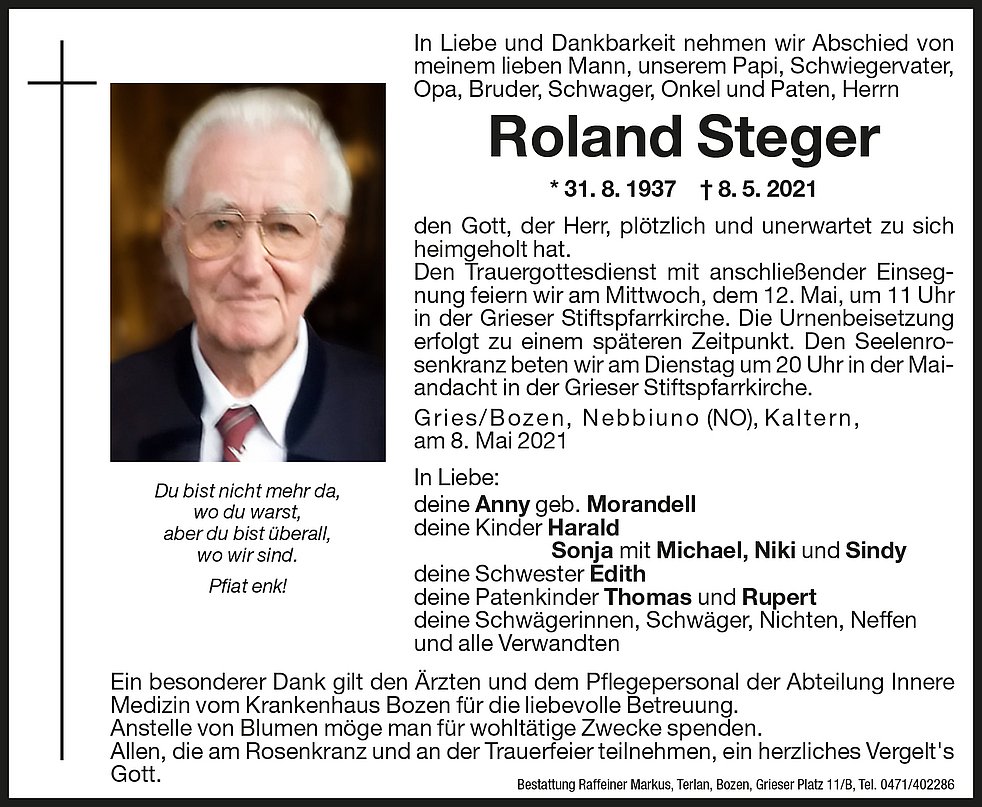 Den Trauergottesdienst mit anschließender Einsegnung feiern wir am Mittwoch, dem 12. Mai, um 11 Uhr in der Grieser Stiftspfarrkirche.