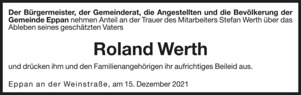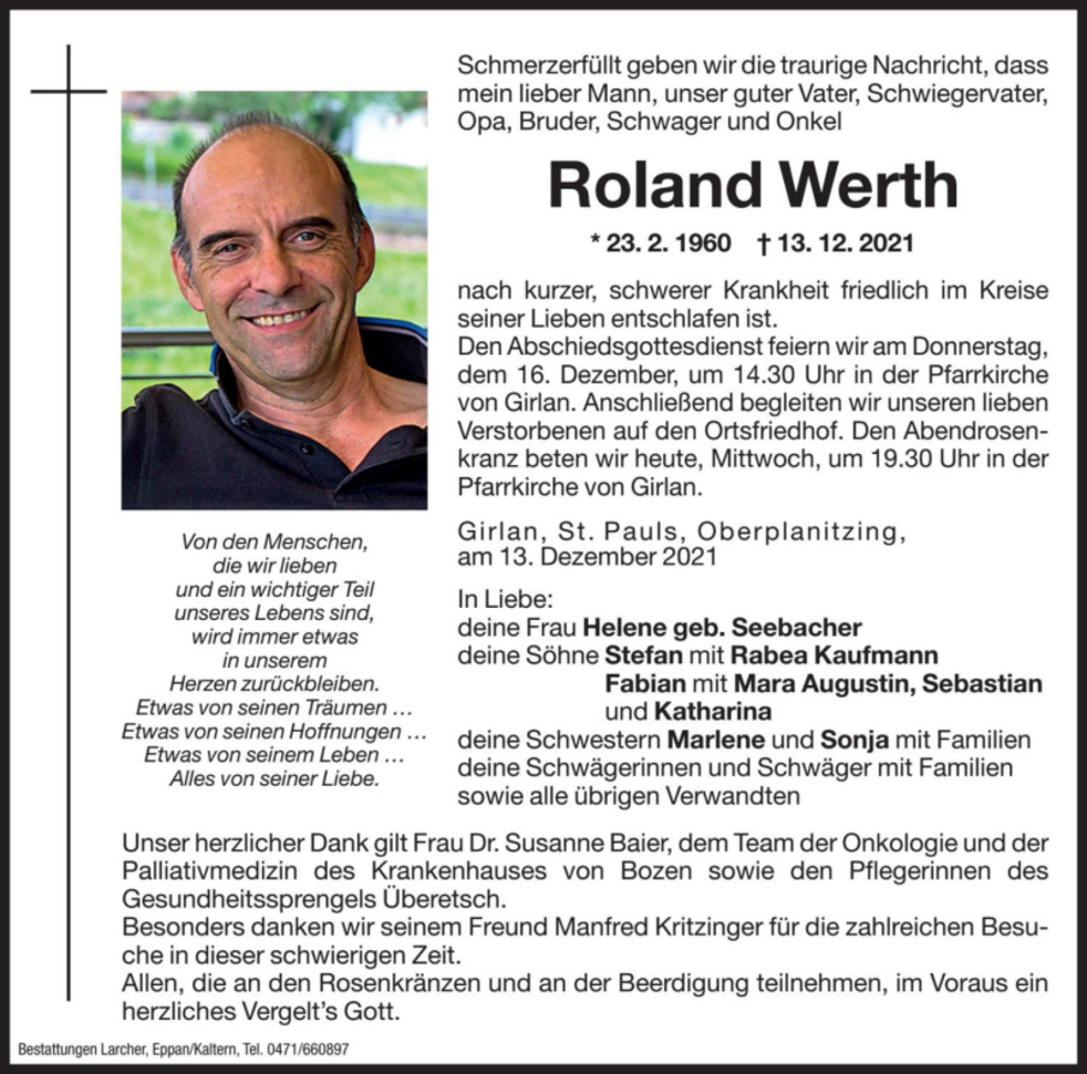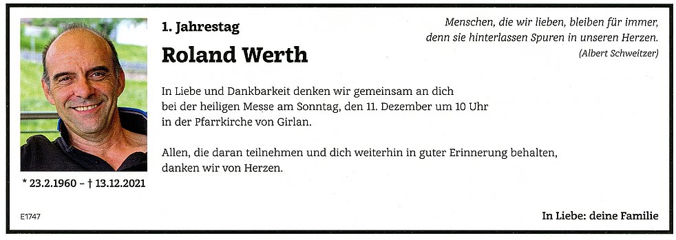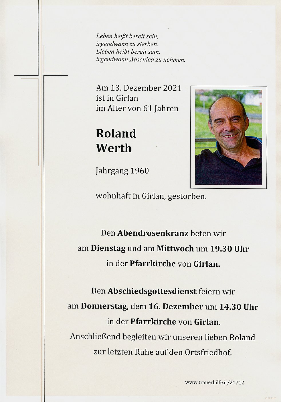 Den Abschiedsgottesdienst feiern wir am Donnerstag, dem 16. Dezember um 14.30 Uhr in der Pfarrkirche von Girlan. Anschließend begleiten wir unseren lieben Verstorbenen auf den Ortsfriedhof.