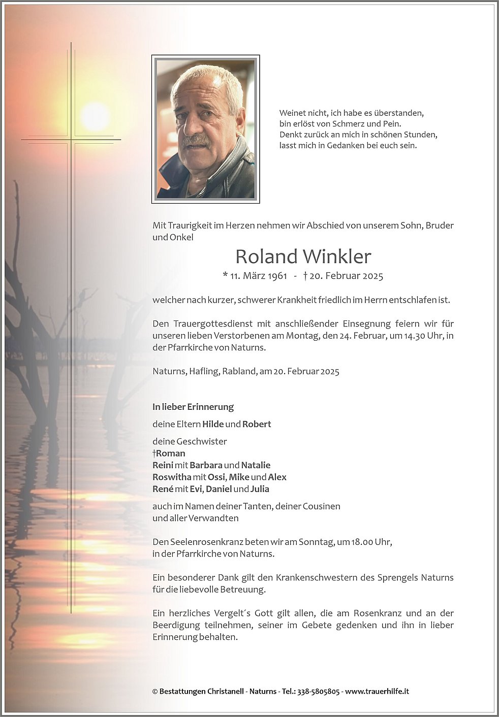 Den Trauergottesdienst mit anschließender Einsegnung feiern wir für unseren lieben Verstorbenen am Montag, den 24. Februar, um 14.30 Uhr, in der Pfarrkirche von Naturns.