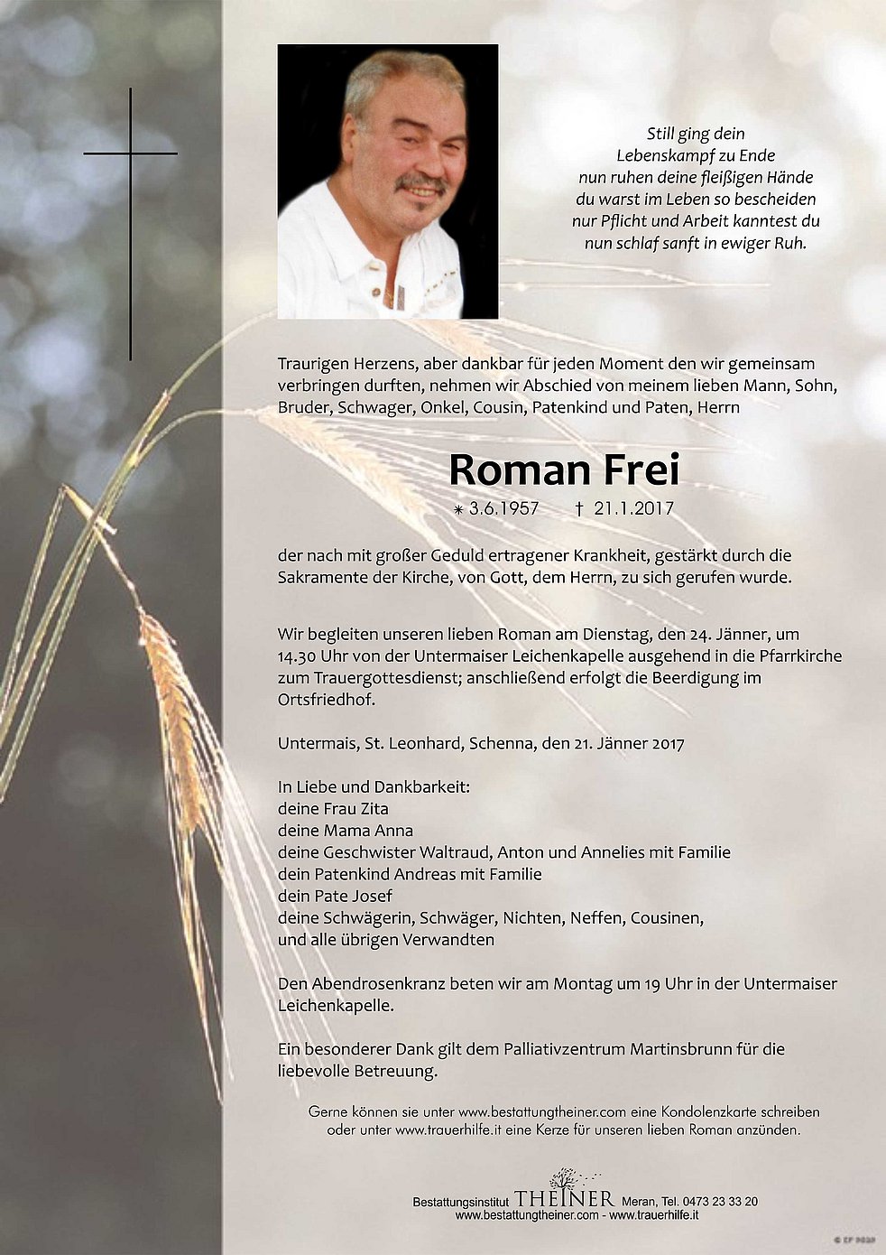 Wir begleiten unseren lieben Roman am Dienstag, den 24. Jänner, um 14.30 Uhr von der Untermaiser Leichenkapelle ausgehend in die Pfarrkirche zum Trauergottesdienst; anschließend erfolgt die Beerdigung im Ortsfriedhof.
