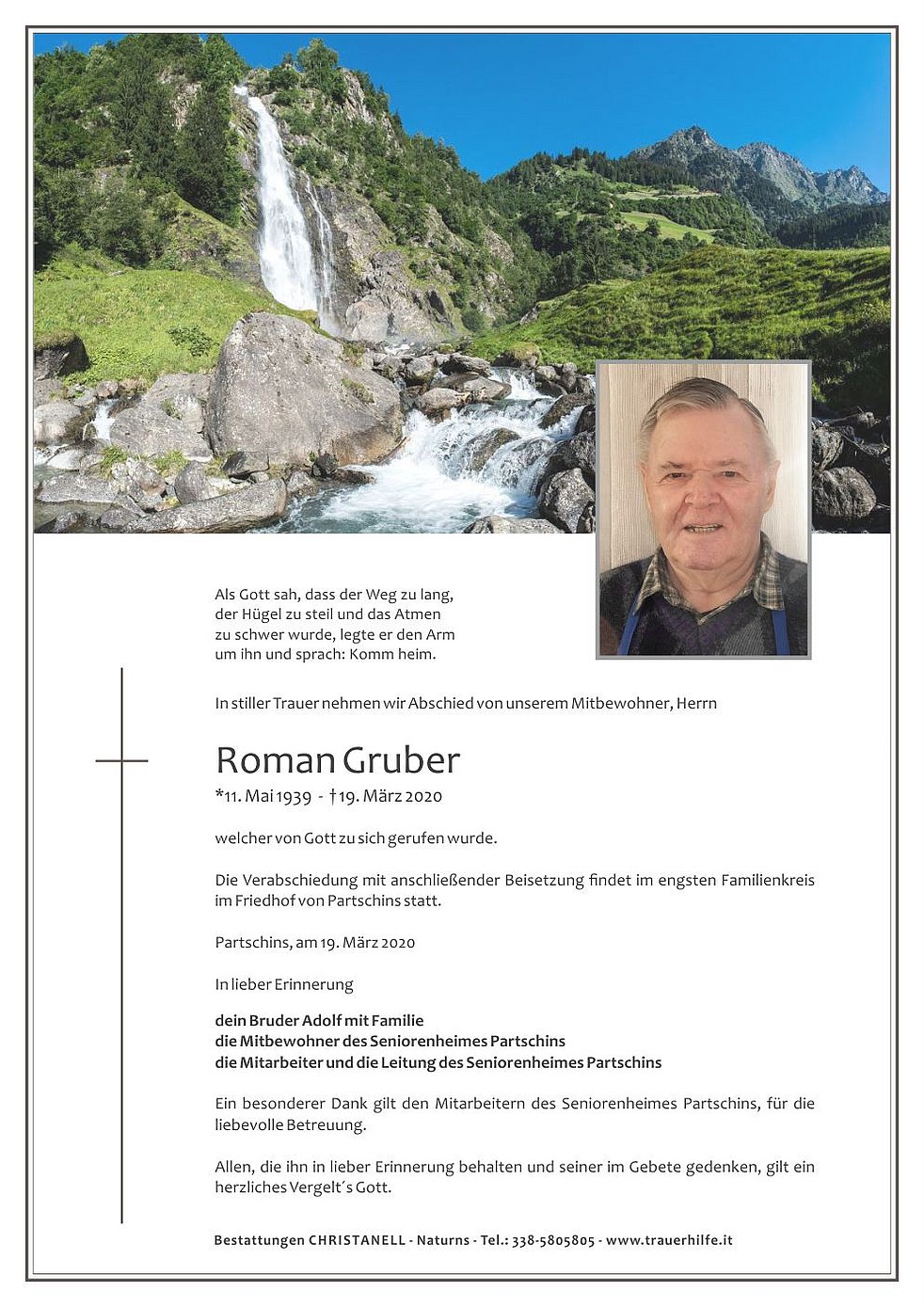 Die Verabschiedung mit anschließender Beisetzung findet im engsten Familienkreis im Friedhof von Partschins statt.