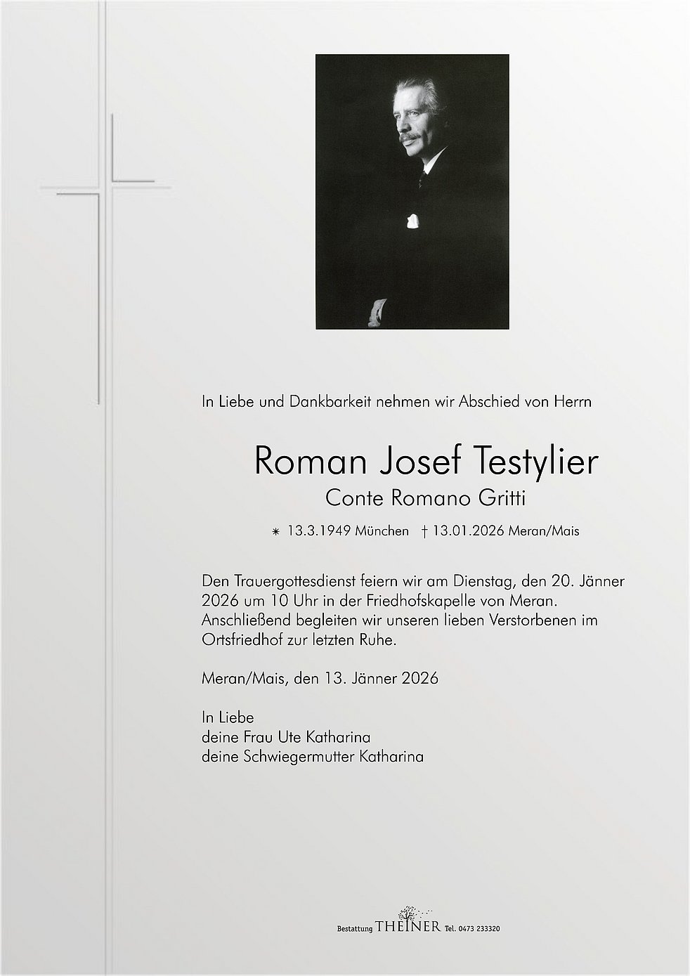 Den Trauergottesdienst feiern wir am Dienstag, den 20. Jänner 2026 um 10 Uhr in der Friedhofskapelle von Meran. Anschließend begleiten wir unseren lieben Verstorbenen im Ortsfriedhof zur letzten Ruhe.