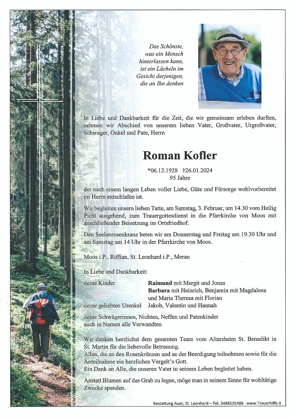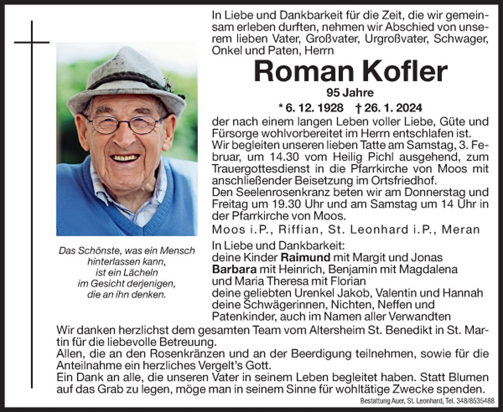 Wir begleiten unsern lieben Tatte, am Samstag, 3. Februar, um 14.30 vom Heilig Pichl ausgehend, zum Trauergottesdienst in die Pfarrkirche von Moos mit anschließender Beisetzung im Ortsfriedhof.
