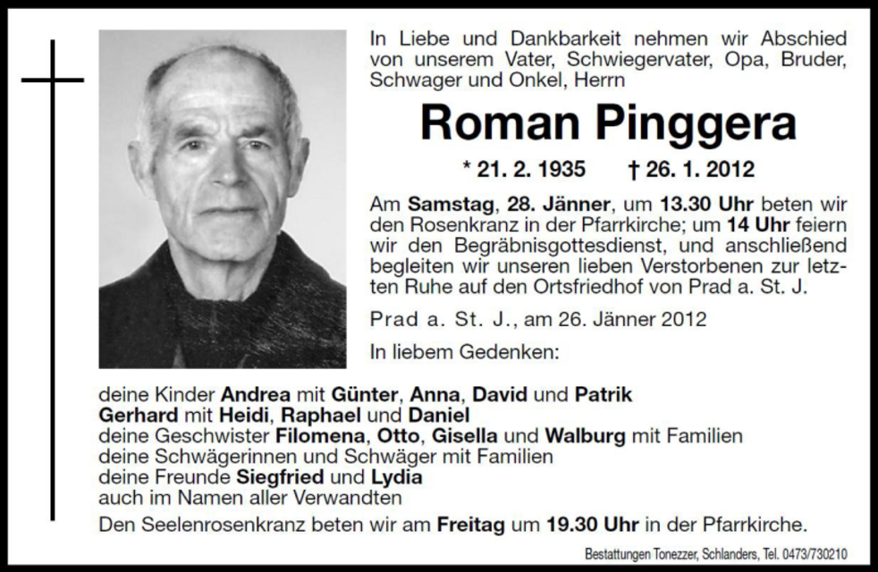 Am Samstag, 28. Jänner, um 13.30 Uhr beten wir den Rosenkranz in der Pfarrkirche; um 14 Uhr feiern wir den Begräbnisgottesdienst und anschließend begleiten wir unseren lieben Vater zur letzten Ruhe auf den Ortsfriedhof von Prad a. St. J.