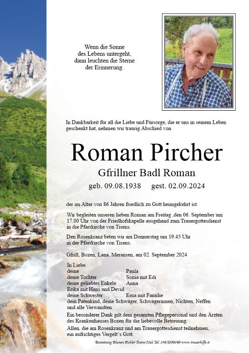 Begräbnisgottesdienst: 06.09. - 17:00 Uhr Pfarrkirche Tisens