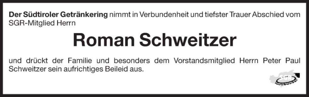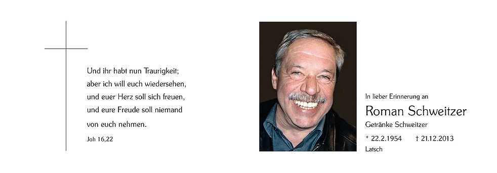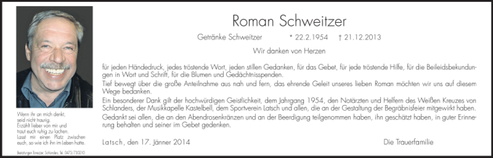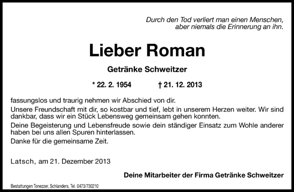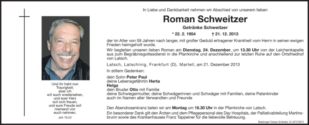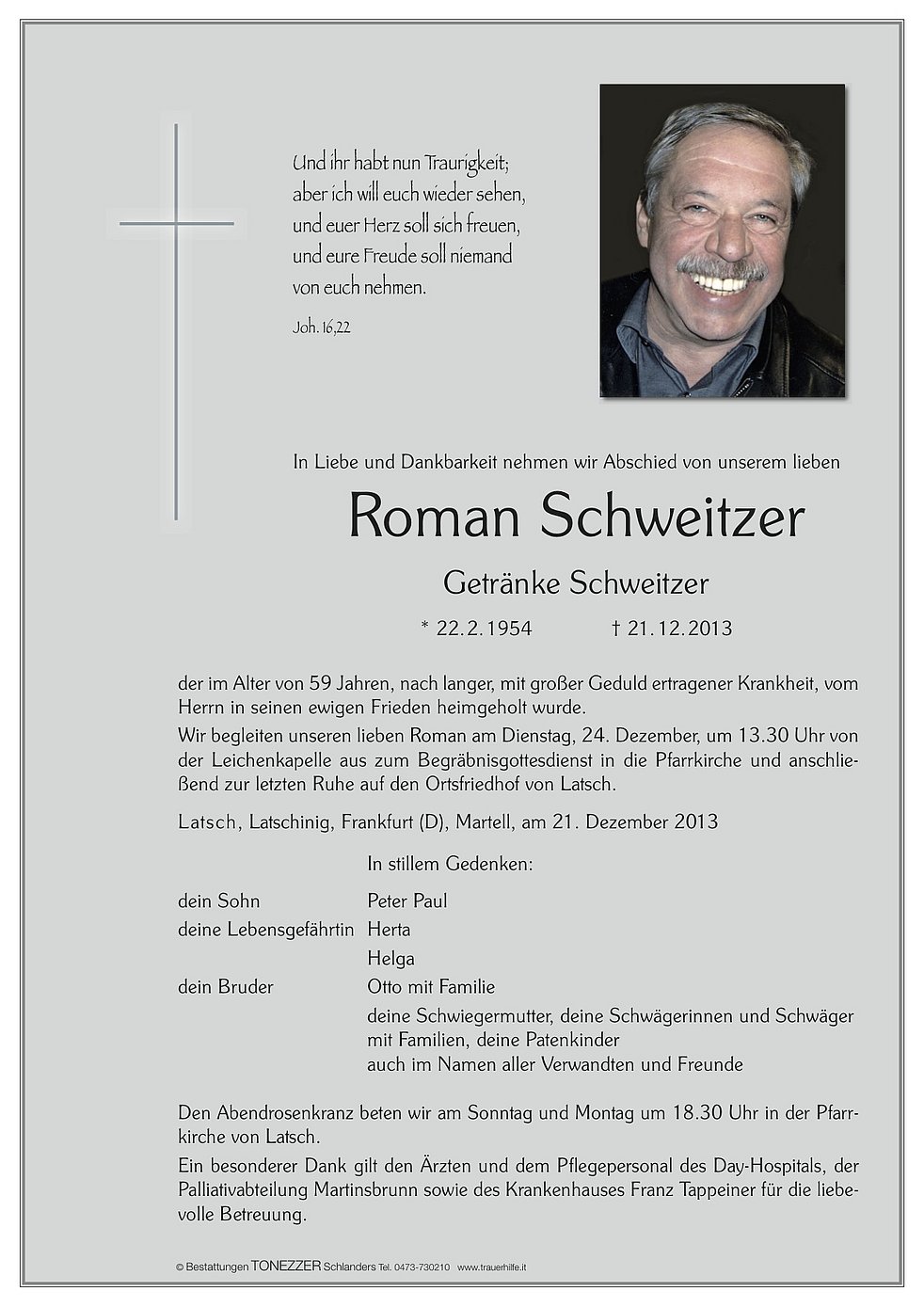 der im Alter von 59 Jahren, nach langer, mit großer Geduld ertragener Krankheit, vom Herrn in seinen ewigen Frieden heimgeholt wurde. Wir begleiten unseren lieben Roman am Dienstag, 24. Dezember, um 13.30 Uhr von der Leichenkapelle aus zum Begräbnisgottesdienst in die Pfarrkirche und anschließend zur letzten Ruhe auf den Ortsfriedhof von Latsch.