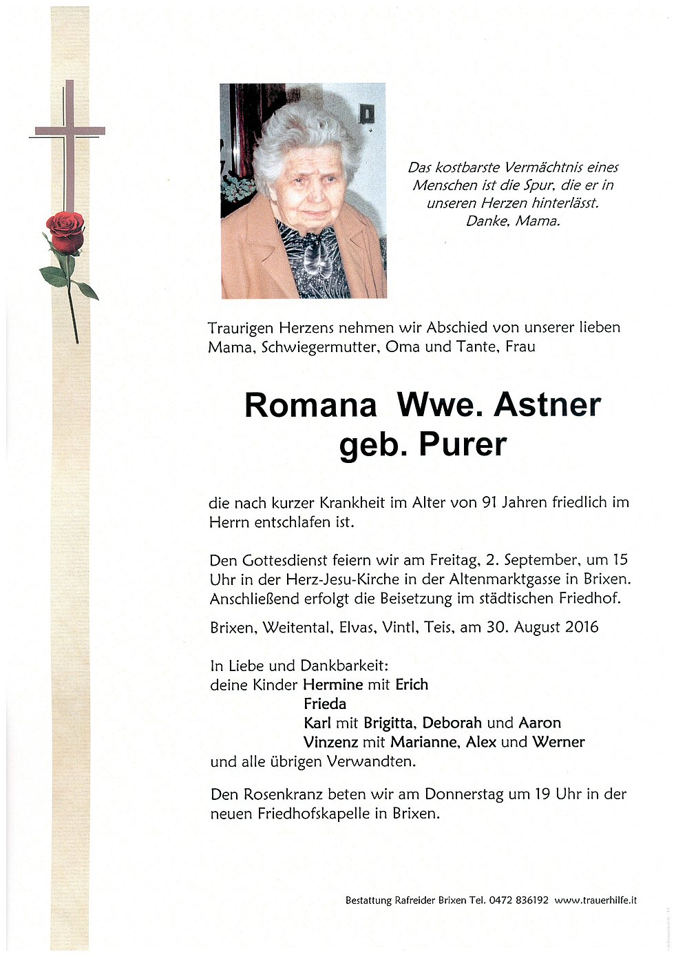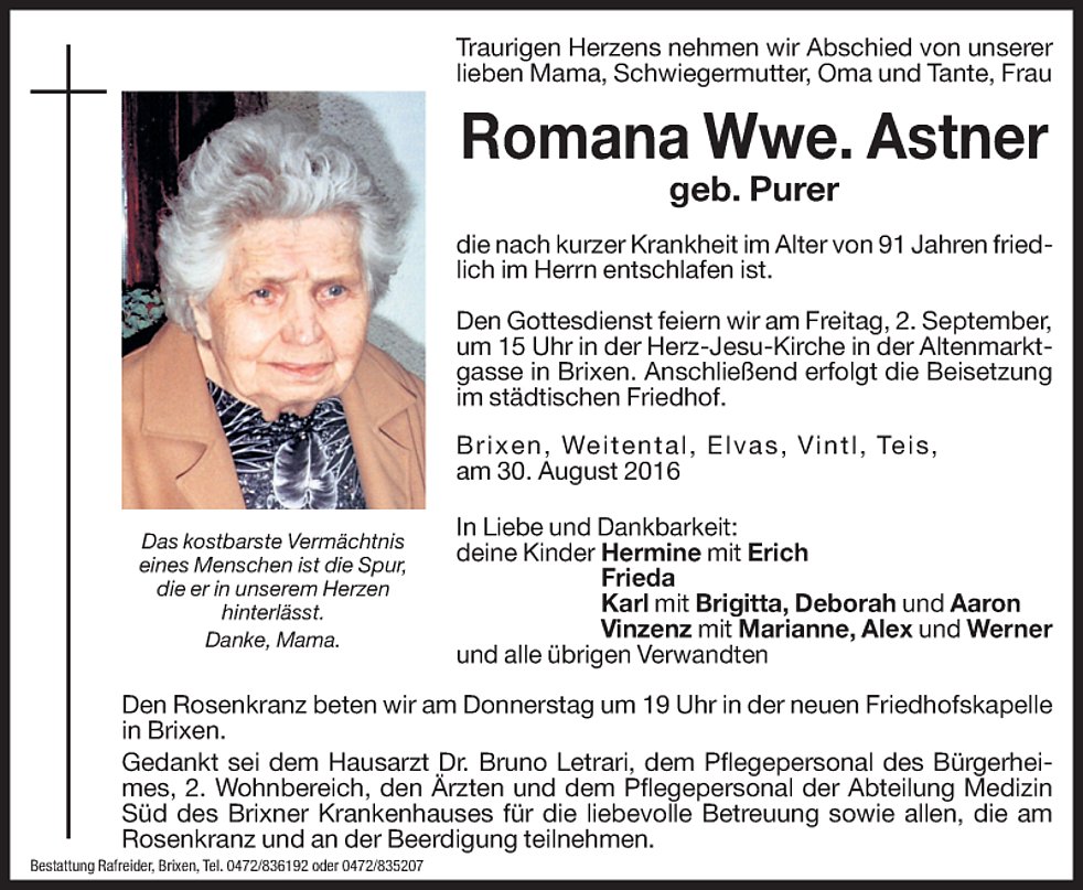 Gedankt sei dem Hausarzt Dr. Bruno Letrari, dem Pflegepersonal des Bürgerheimes, 2. Wohnbereich, den Ärzten und dem Pflegepersonal der Abteilung Medizin Süd des Brixner Krankenhauses für die liebevolle Betreuung, sowie allen, die am Rosenkranz und an der Beerdigung teilnehmen.