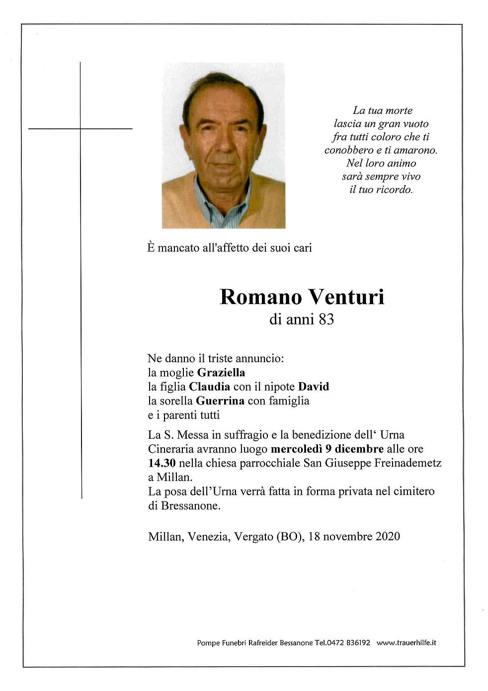 La S. Messa in suffragio e la benedizione dell‘ Urna Cineraria avranno luogo mercoledì 9 dicembre alle ore 14.30 nella chiesa parrocchiale San Giuseppe Freinademetz a Millan.