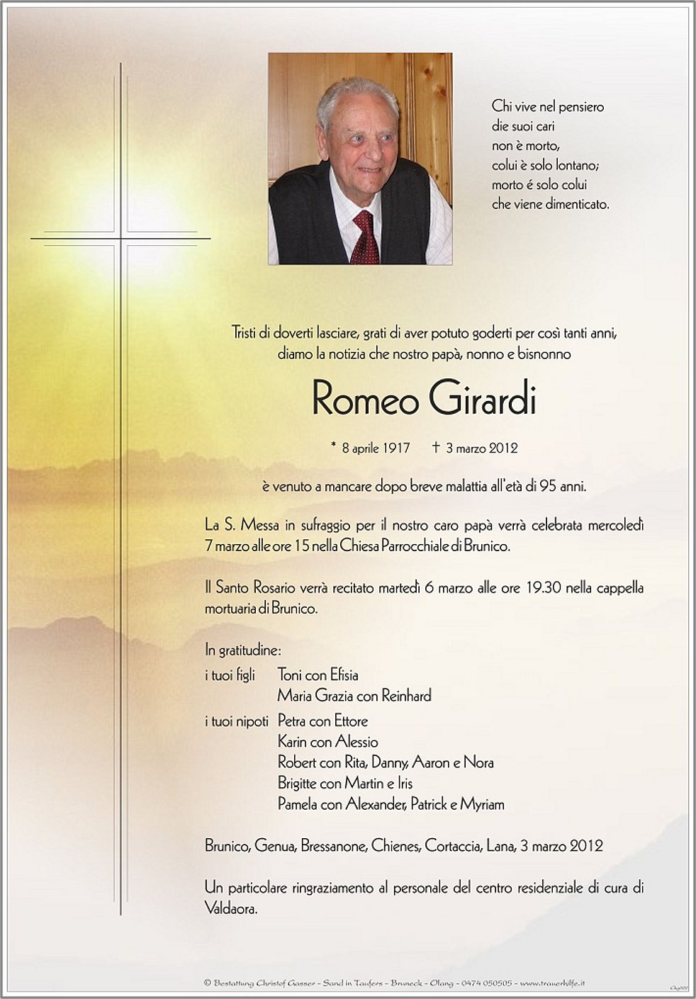 Il Santo Rosario verrà recitato martedì 6 marzo alle ore 19.30 nella cappella mortuaria di Brunico.