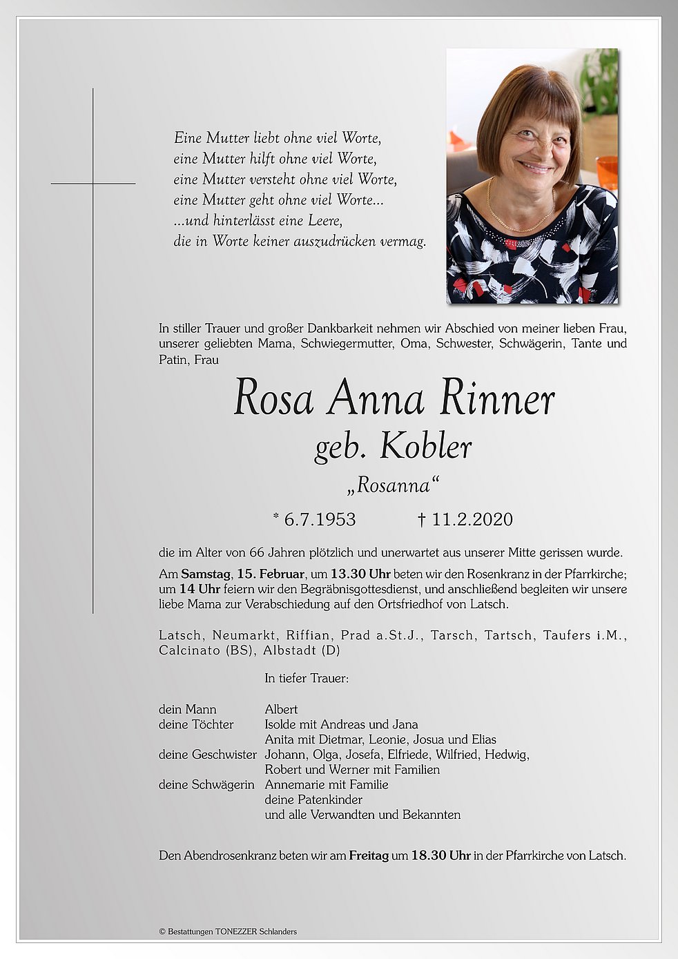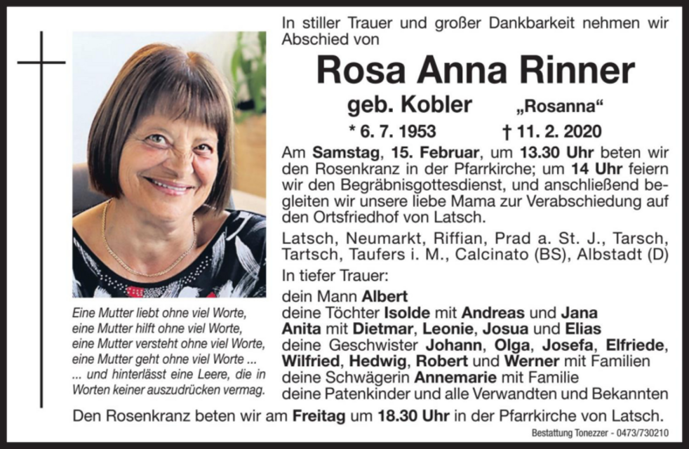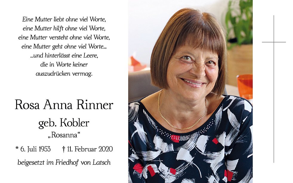 um 14 Uhr feiern wir den Begräbnisgottesdienst, und anschließend begleiten wir unsere liebe Mama zur Verabschiedung auf den Ortsfriedhof von Latsch.