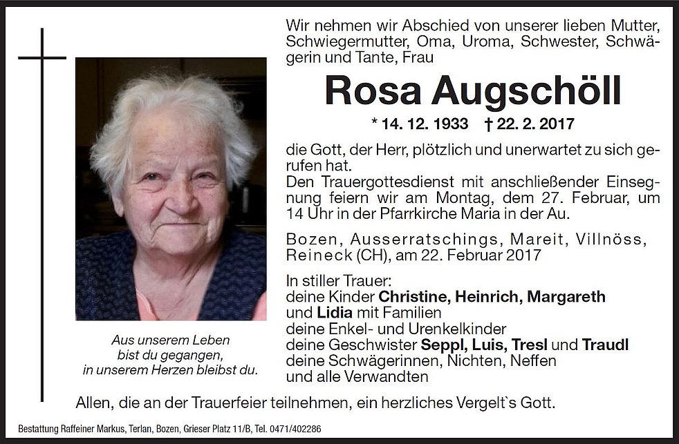 Den Trauergottesdienst mit anschlieβender Einsegnung feiern wir am Montag, dem 27. Februar, um 14 Uhr in der Pfarrkirche Maria in der Au.