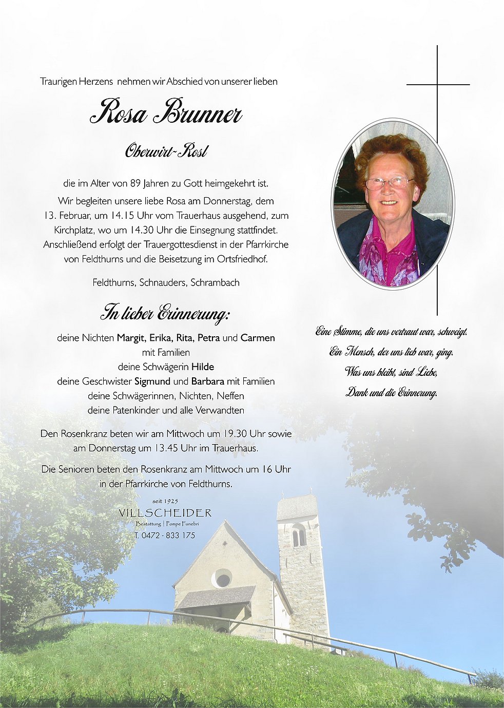 Begräbnisgottesdienst: 13.02. - 14:30 Uhr Feldthurns