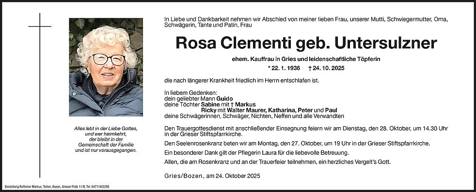 Den Trauergottesdienst mit anschließender Einsegnung feiern wir am Dienstag, den 28. Oktober, um 14.30 Uhr in der Grieser Stiftspfarrkirche.