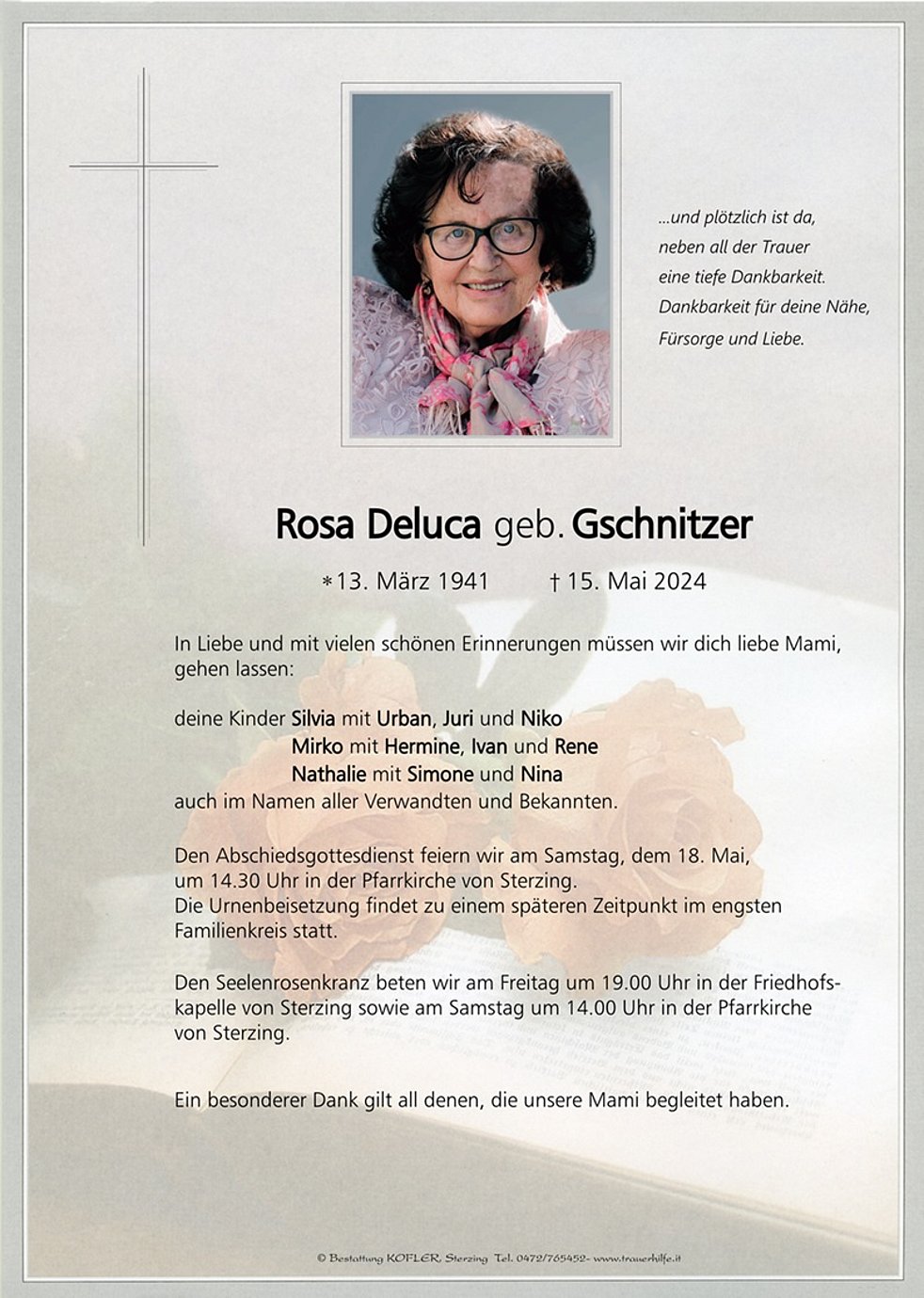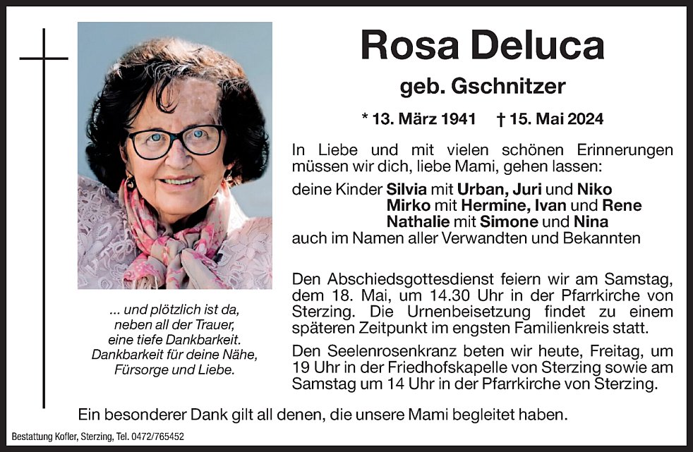 Den Abschiedsgottesdienst feiern wir am Samstag, dem 18. Mai, um 14.30 Uhr in der Pfarrkirche von Sterzing. Die Urnenbeisetzung findet zu einem späteren Zeitpunkt im engsten Familienkreis statt.