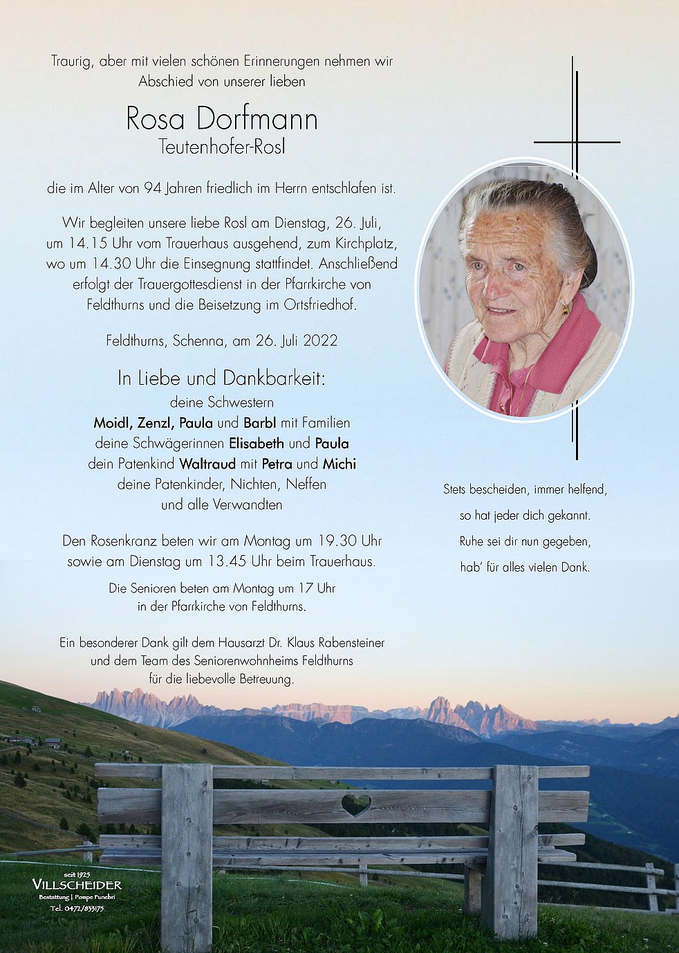 Begräbnisgottesdienst: 26.07. - 14:30 Uhr Feldthurns
