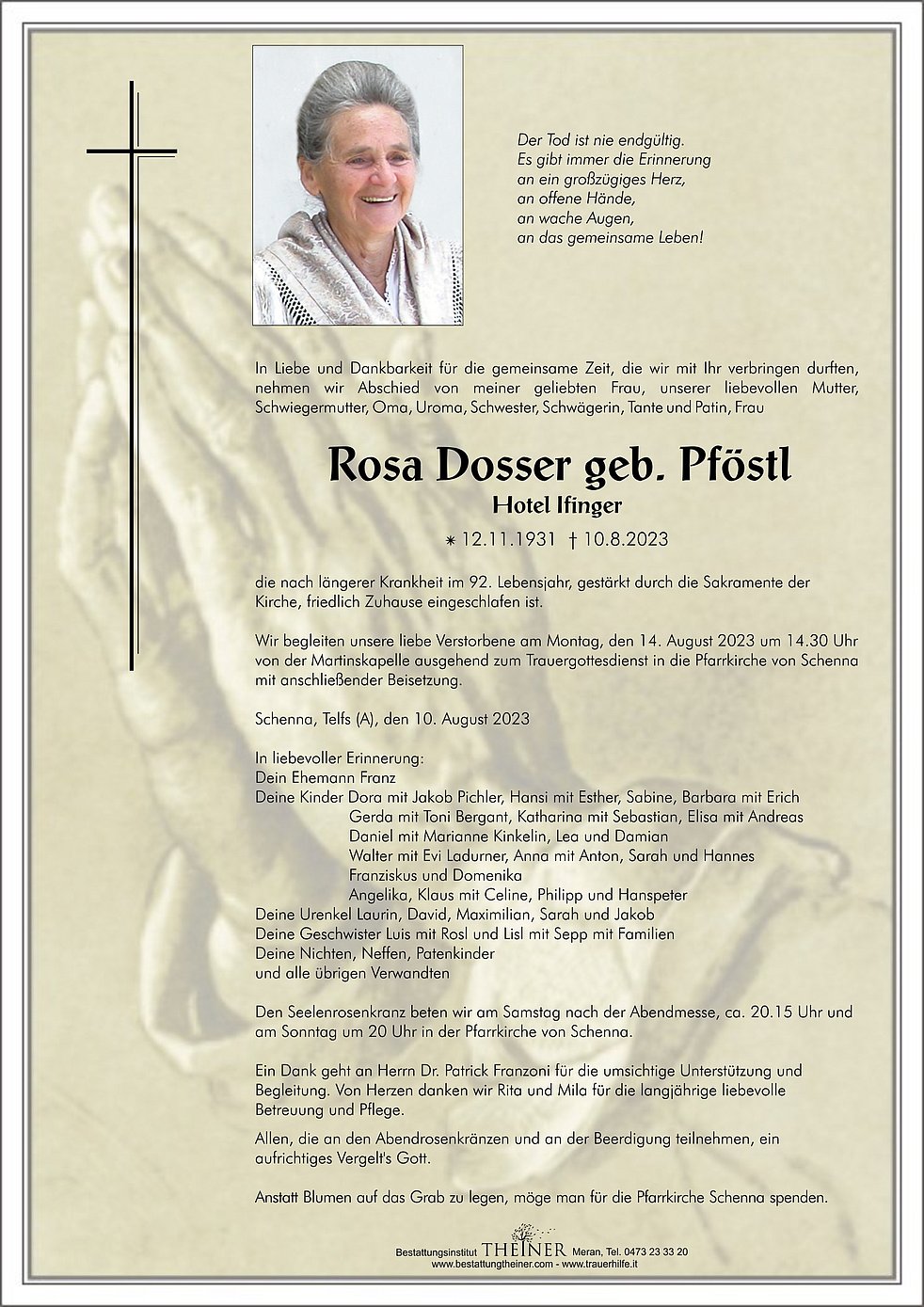 Wir begleiten unsere liebe Verstorbene am Montag, den 14. August 2023 um 14.30 Uhr von der Martinskapelle ausgehend zum Trauergottesdienst in die Pfarrkirche von Schenna mit anschließender Beisetzung.