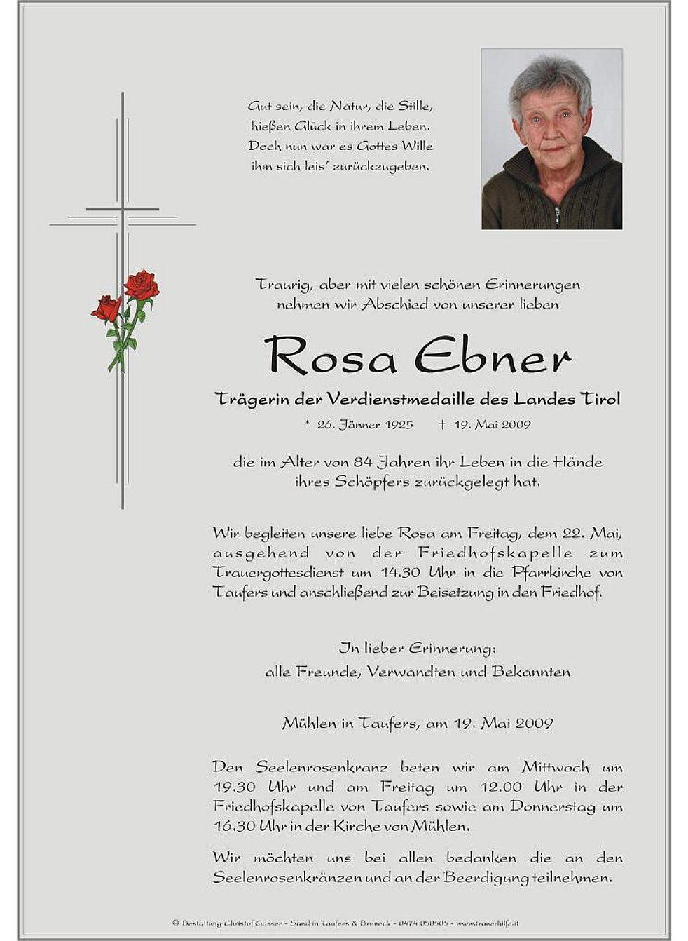Wir begleiten unsere liebe Rosa am Freitag, dem 22. Mai, ausgehend von der Friedhofskapelle zum Trauergottesdienst um 14.30 Uhr in die Pfarrkirche von Taufers und anschließend zur Beisetzung in den Friedhof.