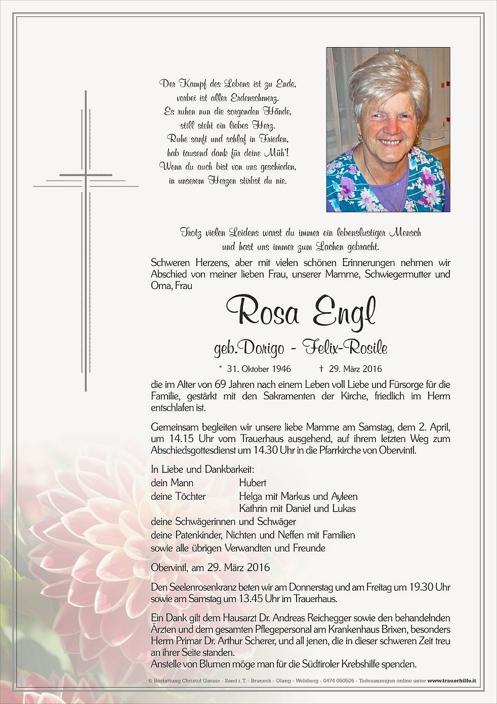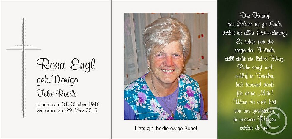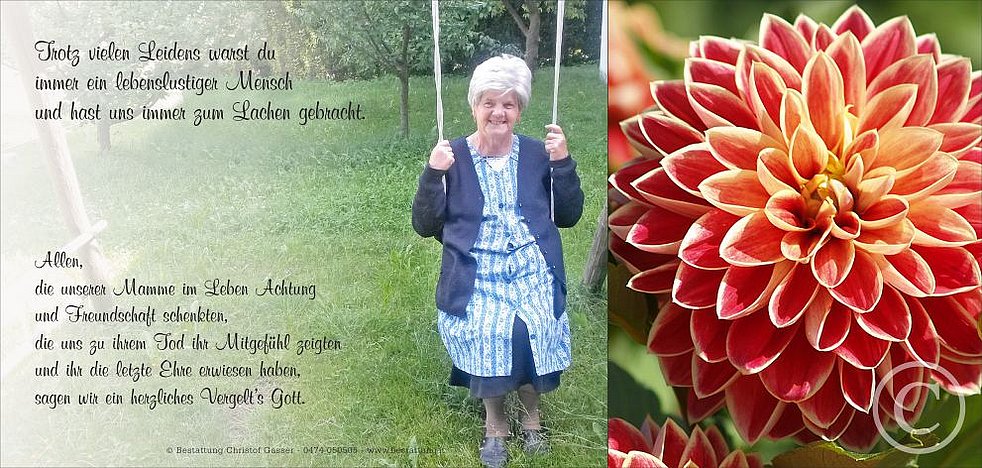 Ein Dank gilt dem Hausarzt Dr. Andreas Reichegger sowie den behandelnden Ärzten und dem gesamten Pflegepersonal am Krankenhaus Brixen, besonders Herrn Primar Dr. Arthur Scherer, und all jenen, die in dieser schweren Zeit treu an ihrer Seite standen.