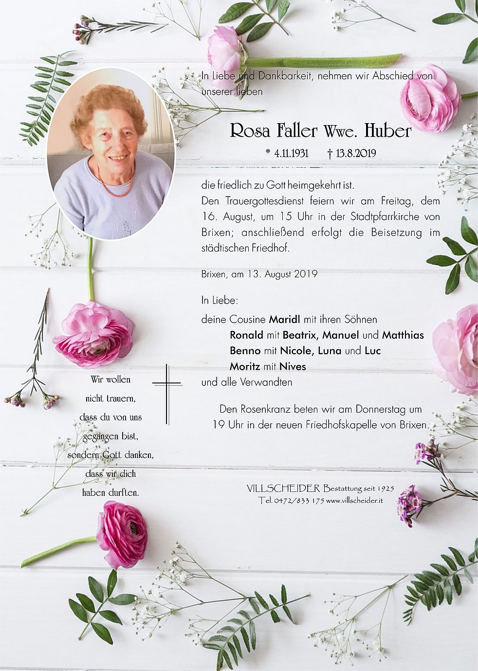 Trauerfeier: 16.08. - 15:00 Uhr Brixen; Bressanone