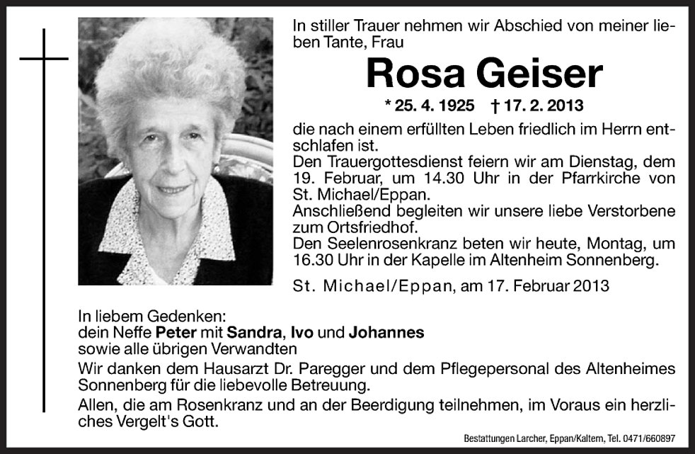 Den Trauergottesdienst feiern wir am Dienstag, den 19. Februar um 14.30 Uhr in der Pfarrkirche von St. Michael/Eppan. Anschließend begleiten wir unsere liebe Verstorbene zum Ortsfriedhof.