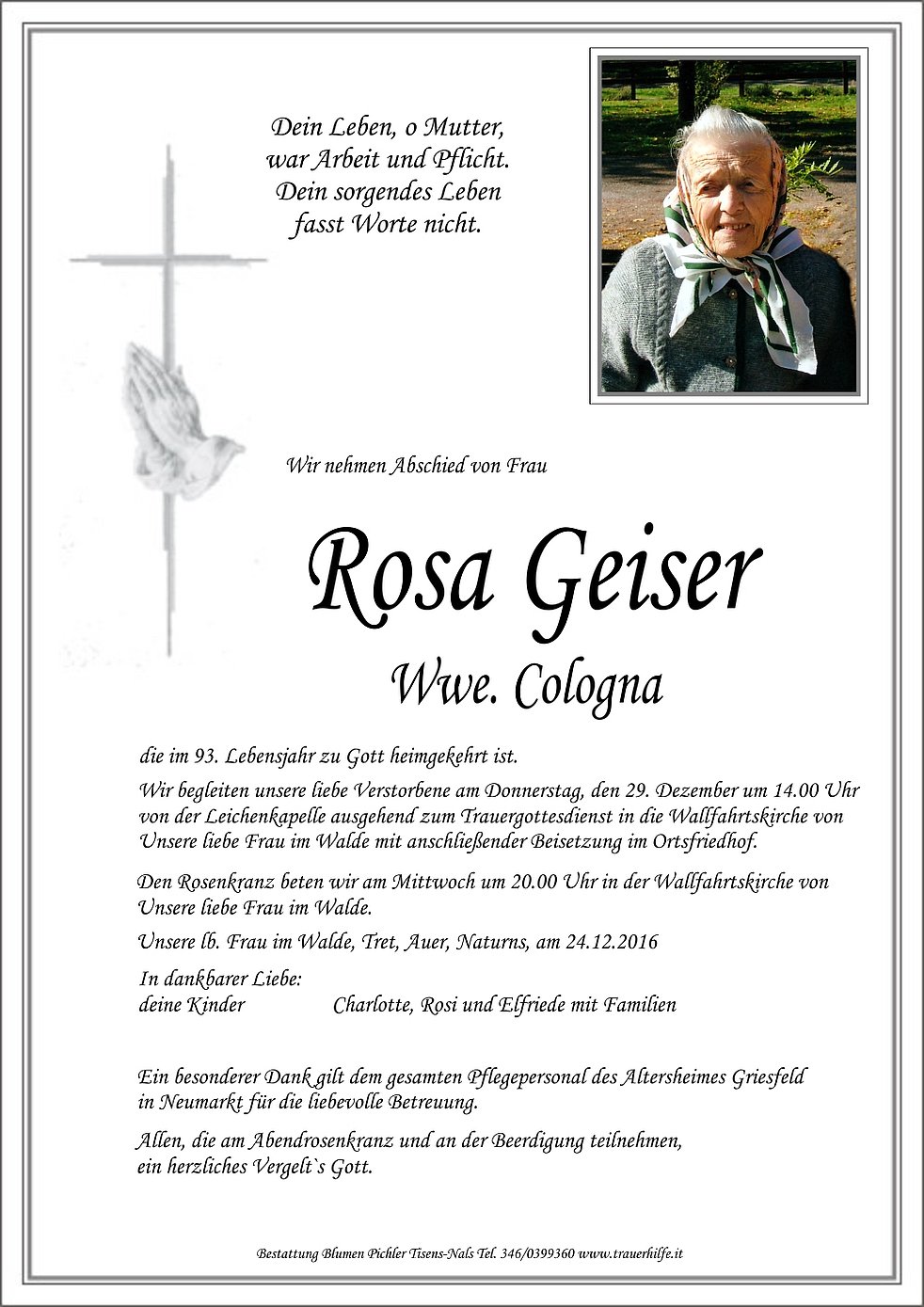 Wir begleiten unsere liebe Verstorbene am Donnerstag, den 29. Dezember um 14.00 Uhr