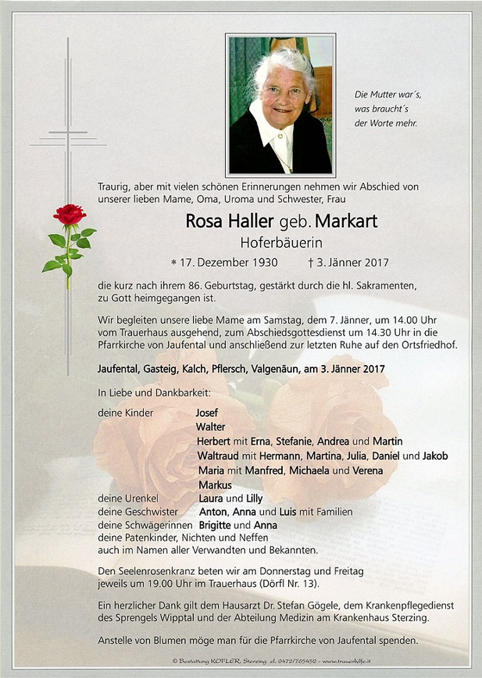 Wir begleiten unsere liebe Mame am Samstag, dem 7. Jänner, um 14.00 Uhr vom Trauerhaus ausgehend, zum Abschiedsgottesdienst um 14.30 Uhr in die Pfarrkirche von Jaufental und anschließend zur letzten Ruhe auf den Ortsfriedhof.