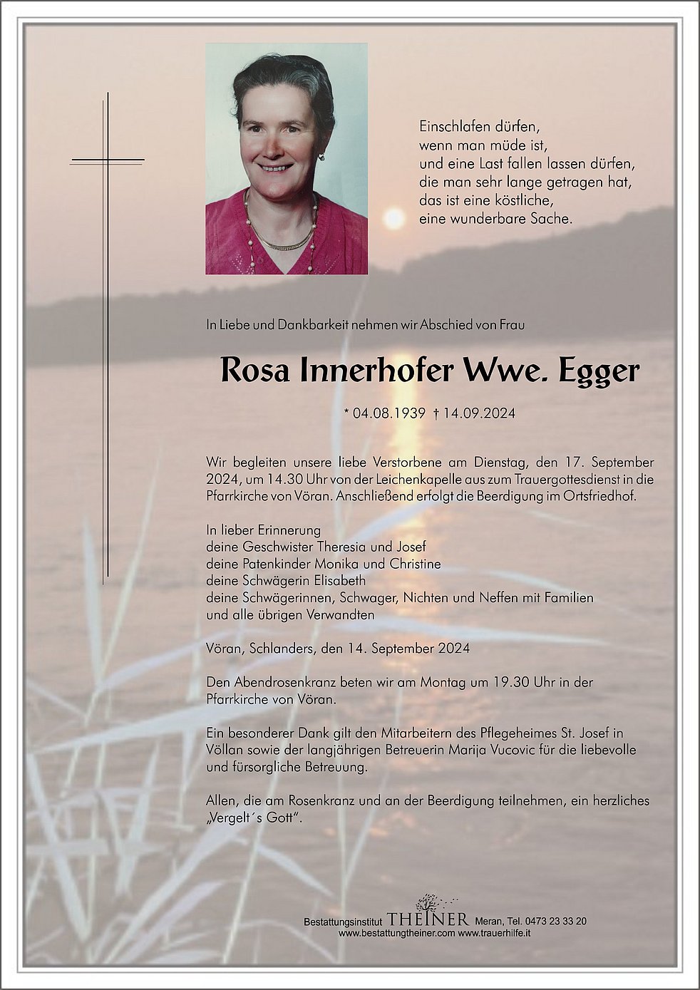 Wir begleiten unsere liebe Verstorbene am Dienstag, den 17. September 2024, um 14.30 Uhr von der Leichenkapelle aus zum Trauergottesdienst in die Pfarrkirche von Vöran. Anschließend erfolgt die Beerdigung im Ortsfriedhof.