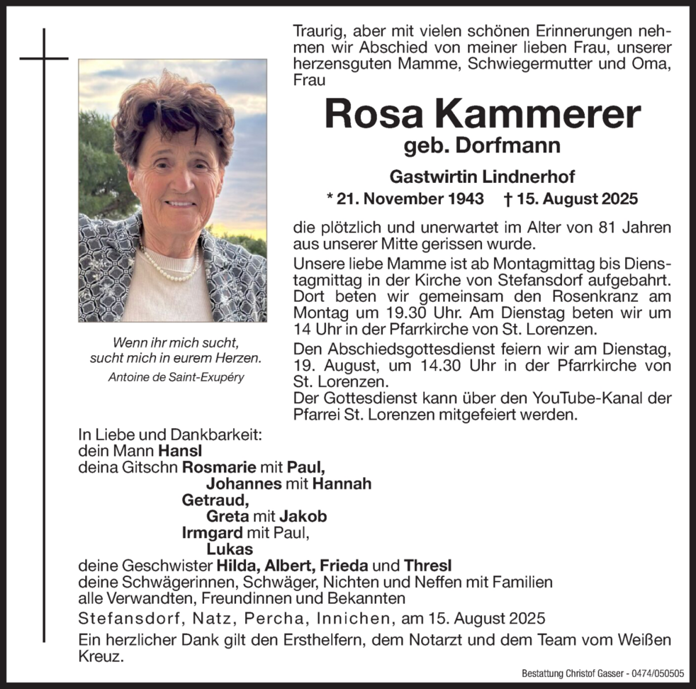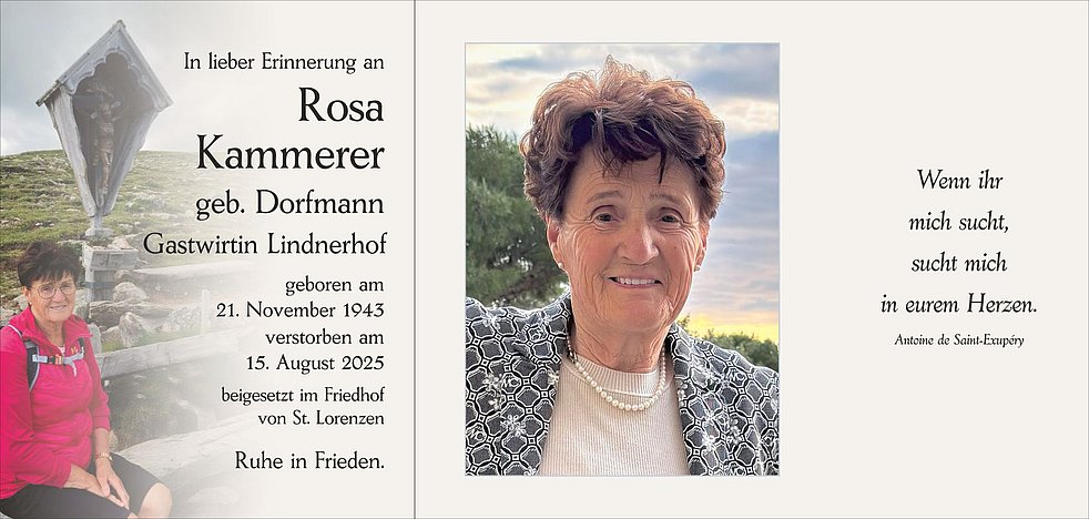 Unsere liebe Mamme ist ab Montagmittag bis Dienstagmittag in der Kirche von Stefansdorf aufgebahrt. Dort beten wir gemeinsam den Rosenkranz am Montag um 19.30 Uhr. Am Dienstag beten wir um 14 Uhr in der Pfarrkirche von St. Lorenzen.