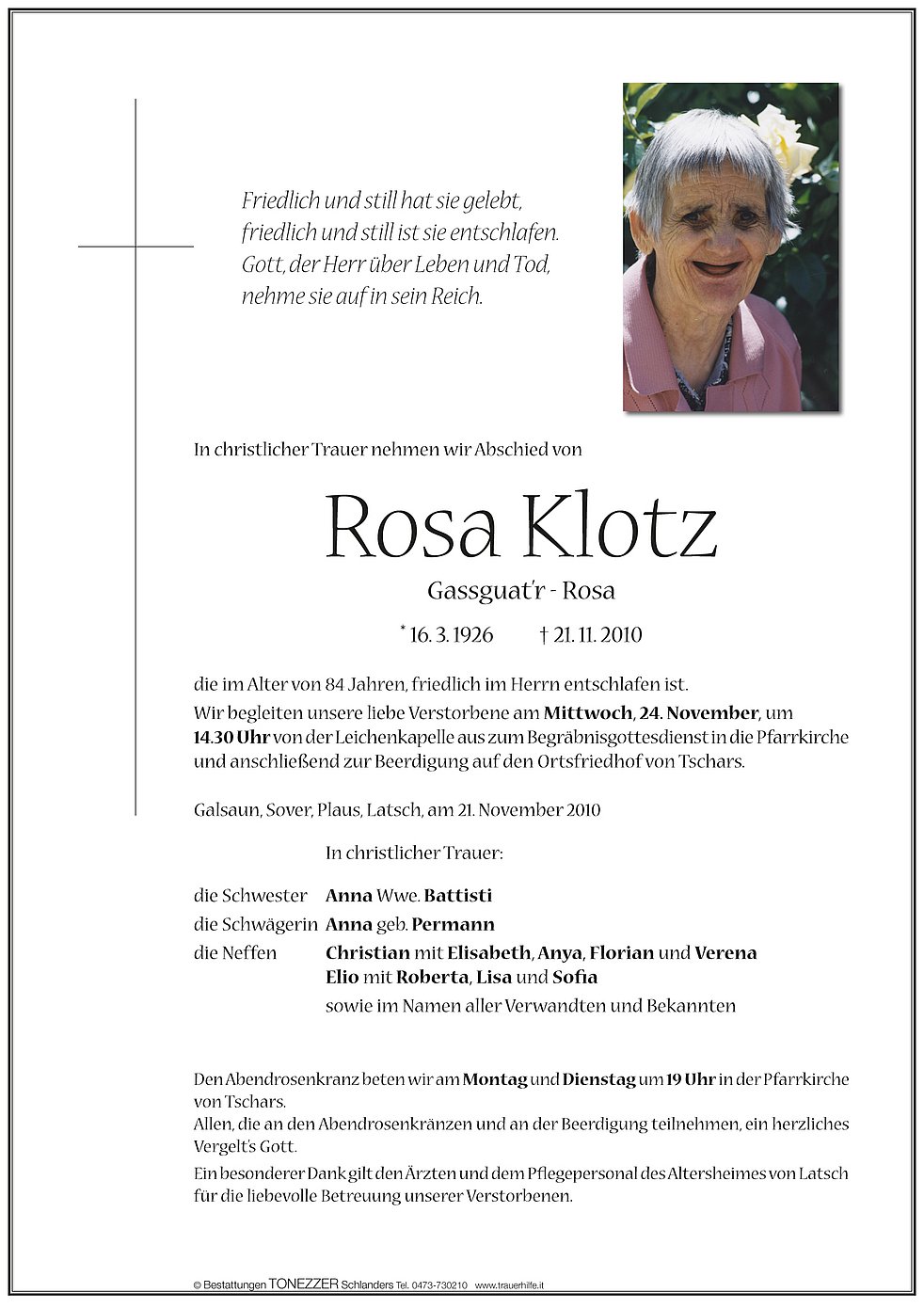 Wir begleiten unsere liebe Verstorbene am Mittwoch, 24. November, um 14.30 Uhr von der Leichenkapelle aus zum Begräbnisgottesdienst in die Pfarrkirche und anschließend zur Beerdigung auf den Ortsfriedhof von Tschars.