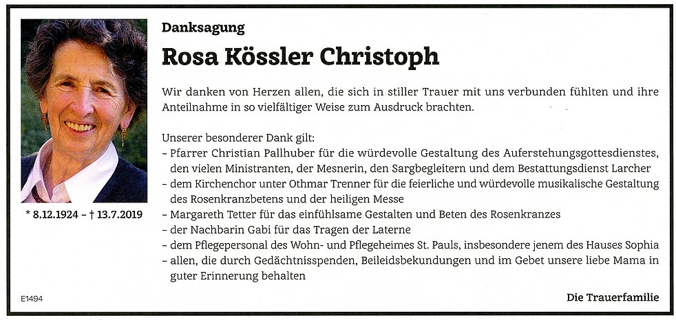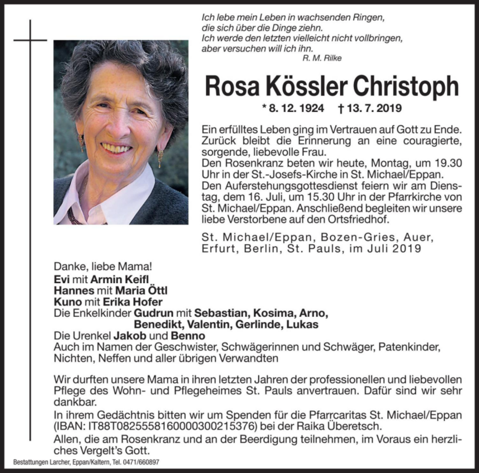 In ihrem Gedächtnis bitten wir um Spenden für die Pfarrcaritas St. Michael/Eppan (Iban: IT88T0825558160000300215376) bei der Raika Überetsch.