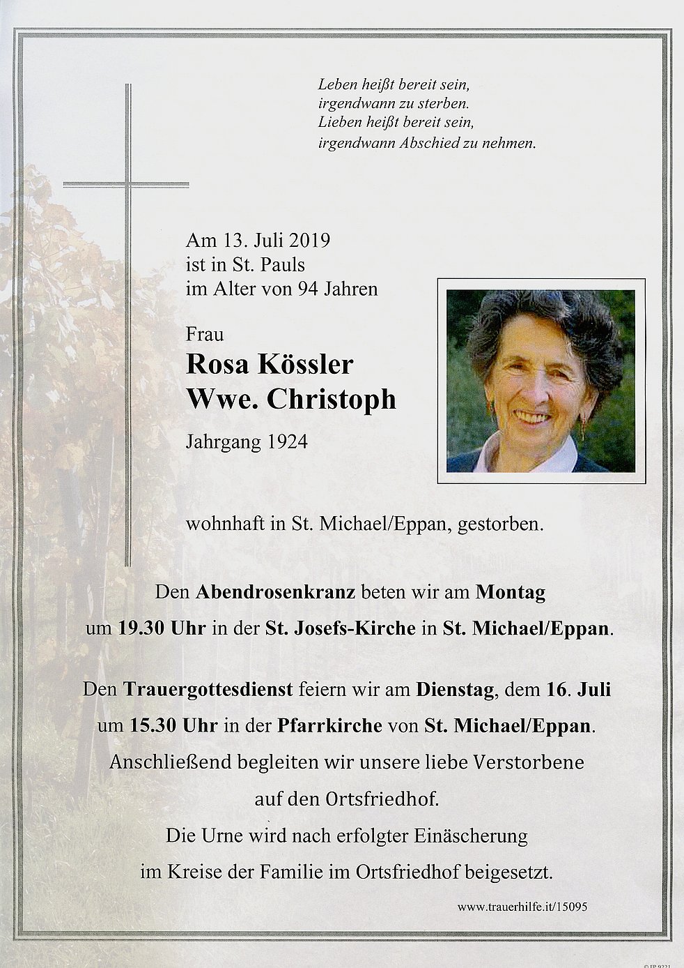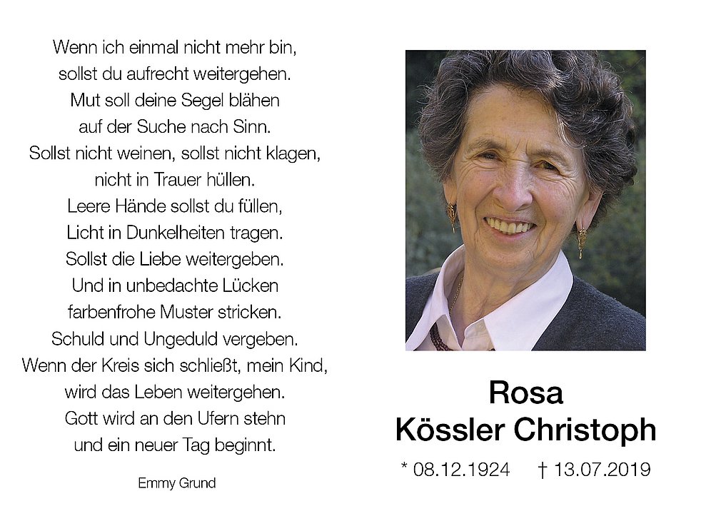 Den Auferstehungsgottesdienst feiern wir am Dienstag, dem 16. Juli um 15.30 Uhr in der Pfarrkirche von St. Michael Eppan. Anschließend begleiten wir unsere liebe Verstorbene auf den Ortsfriedhof.
