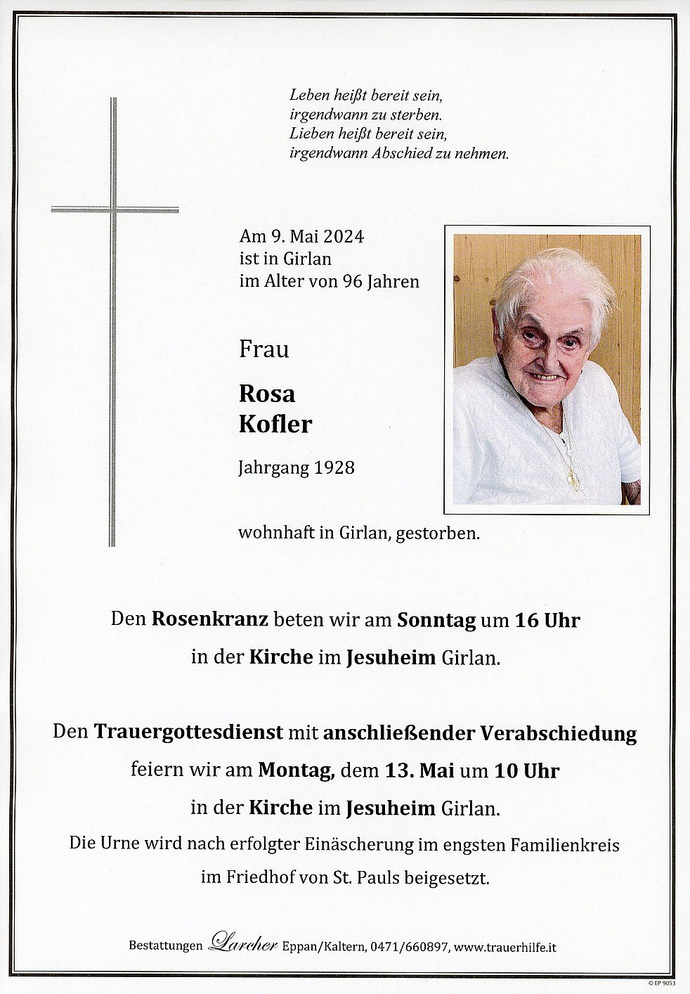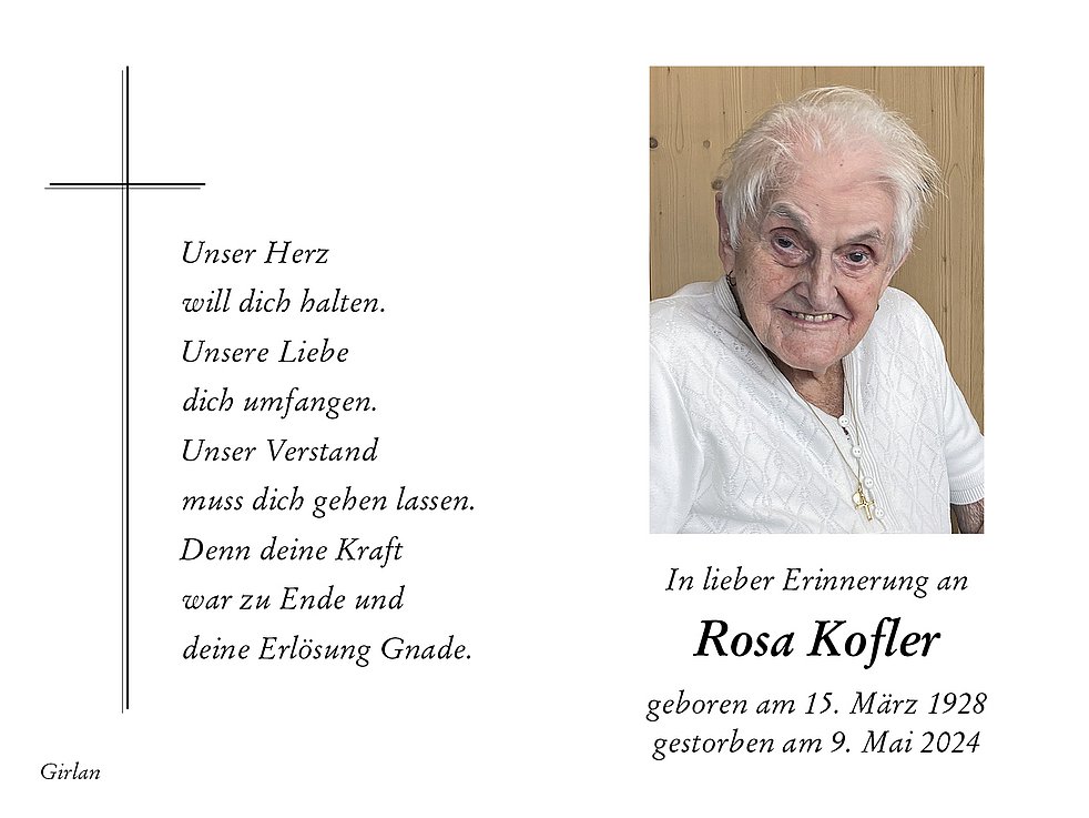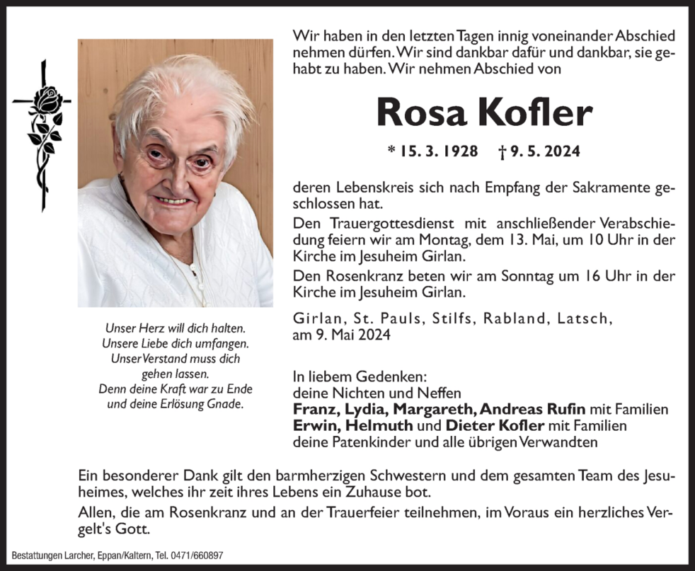 Den Trauergottesdienst mit anschliessender Verabschiedung feiern wir am Montag, dem 13. Mai um 10 Uhr in der Kirche im Jesuheim Girlan.