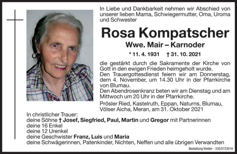 Den Trauergottesdienst feiern wir am Donnerstag, dem 4. November, um 14.30 Uhr in der Pfarrkirche von Blumau.