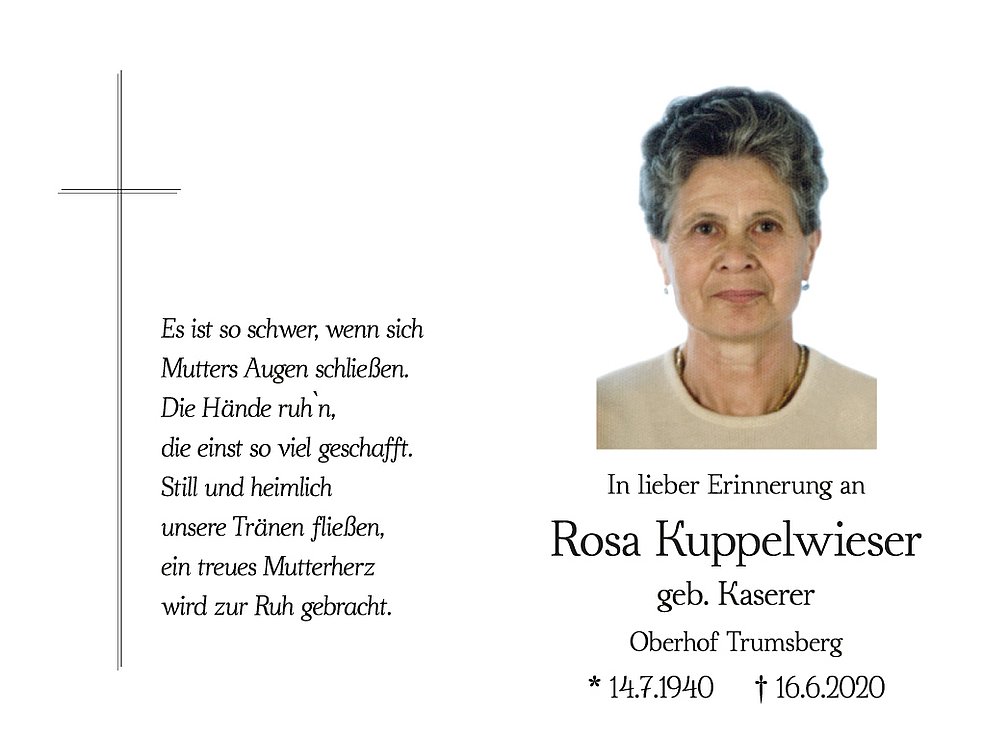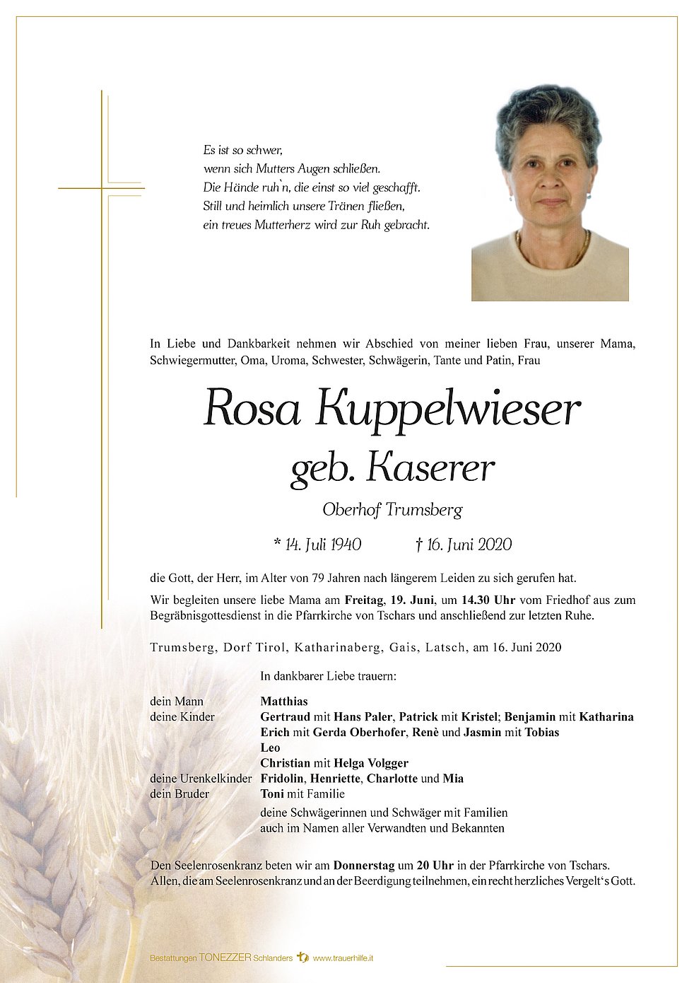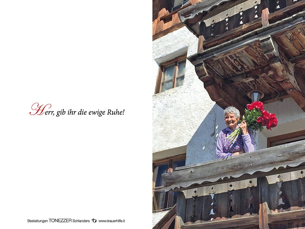 Wir begleiten unsere liebe Mama am Freitag, 19. Juni, um 14.30 Uhr vom Friedhof aus zum Begräbnisgottesdienst in die Pfarrkirche von Tschars und anschließend zur letzten Ruhe.