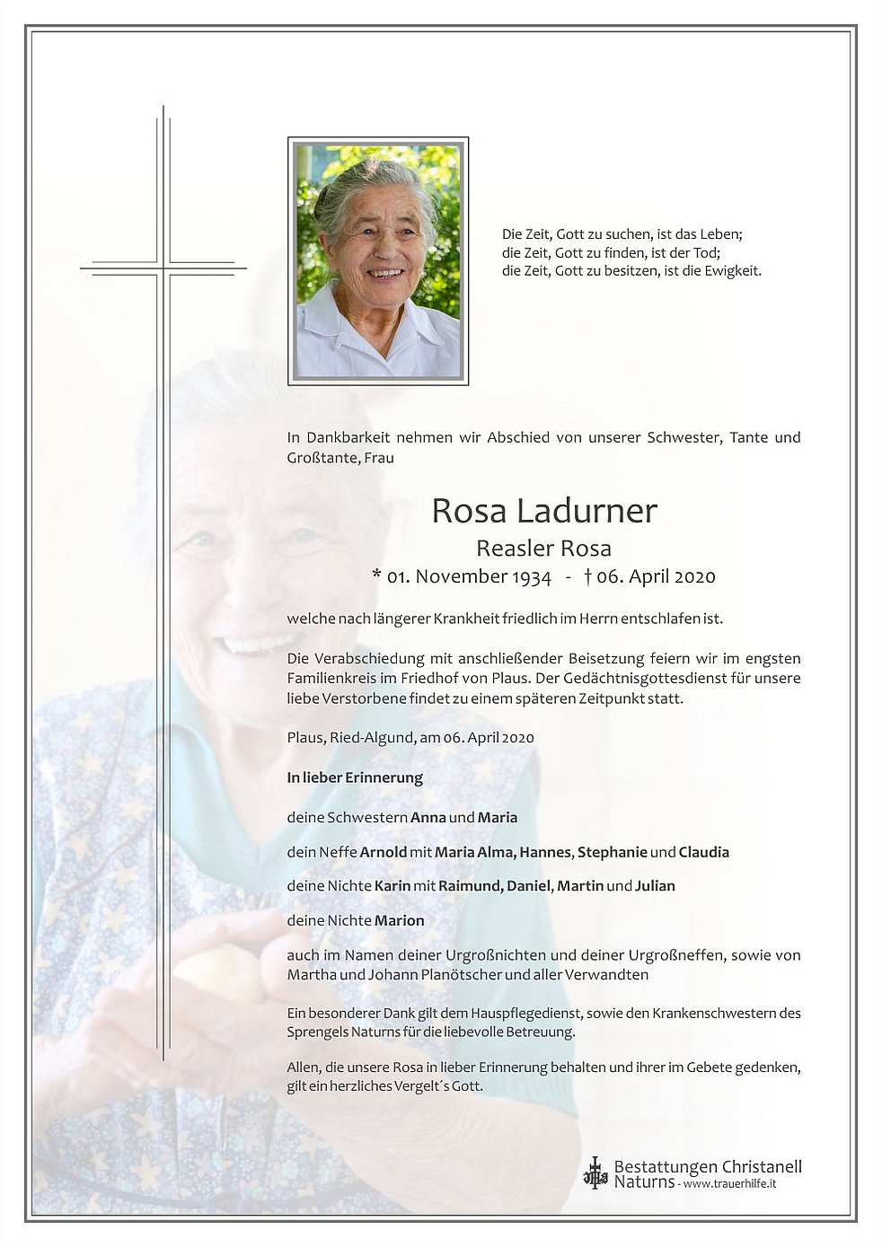 Die Verabschiedung mit anschließender Beisetzung feiern wir im engsten Familienkreis im Friedhof von Plaus. Der Gedächtnisgottesdienst für unsere liebe Verstorbene findet zu einem späteren Zeitpunkt statt.
