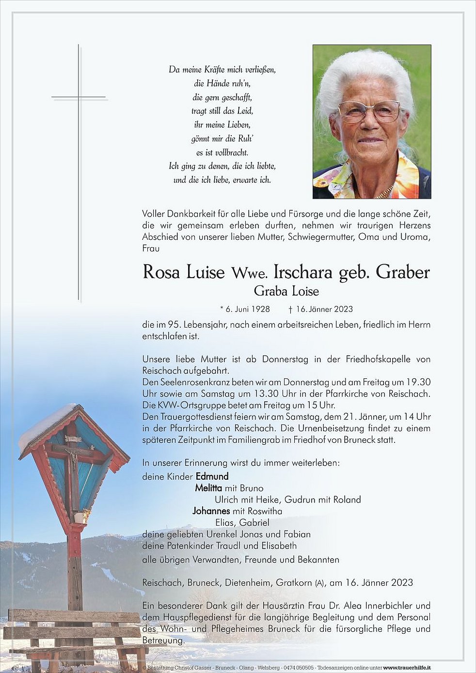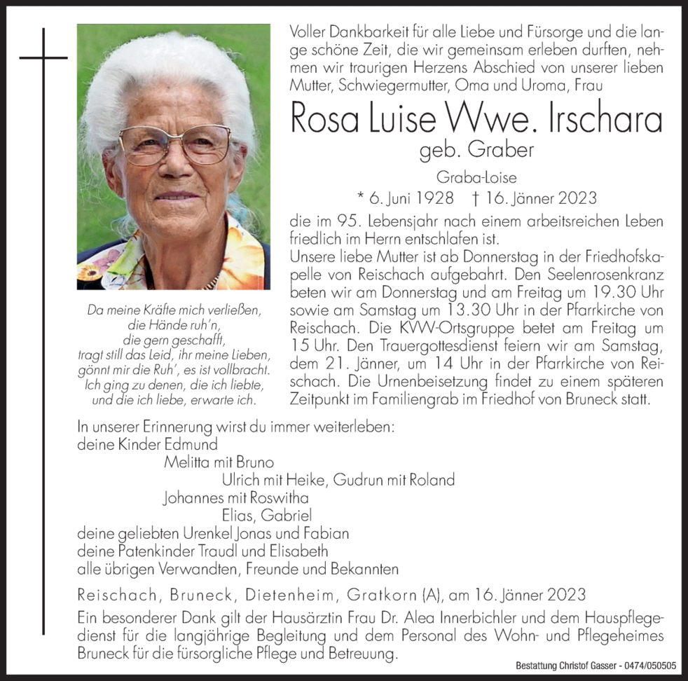 Den Trauergottesdienst feiern wir am Samstag, dem 21. Jänner, um 14 Uhr in der Pfarrkirche von Reischach. Die Urnenbeisetzung findet zu einem späteren Zeitpunkt im Familiengrab im Friedhof von Bruneck statt.