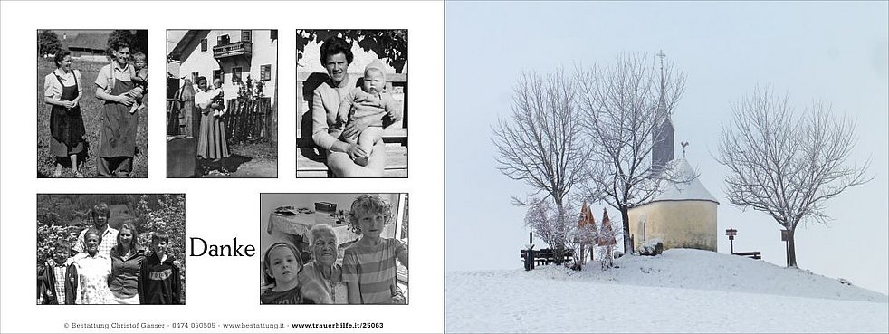 Ein besonderer Dank gilt der Hausärztin Frau Dr. Alea Innerbichler und dem Hauspflegedienst für die langjährige Begleitung und dem Personal des Wohn- und Pflegeheimes Bruneck für die fürsorgliche Pflege und Betreuung.
