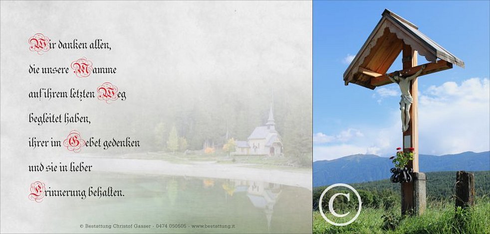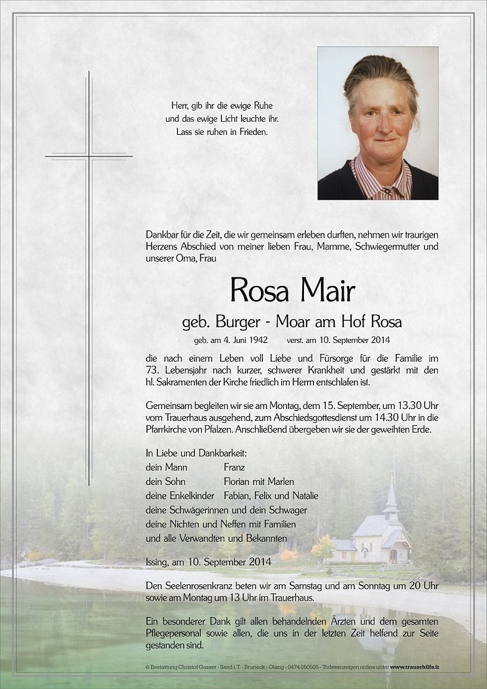 Gemeinsam begleiten wir sie am Montag, dem 15. September, um 13.30 Uhr vom Trauerhaus ausgehend, zum Abschiedsgottesdienst um 14.30 Uhr in die Pfarrkirche von Pfalzen. Anschließend übergeben wir sie der geweihten Erde.
