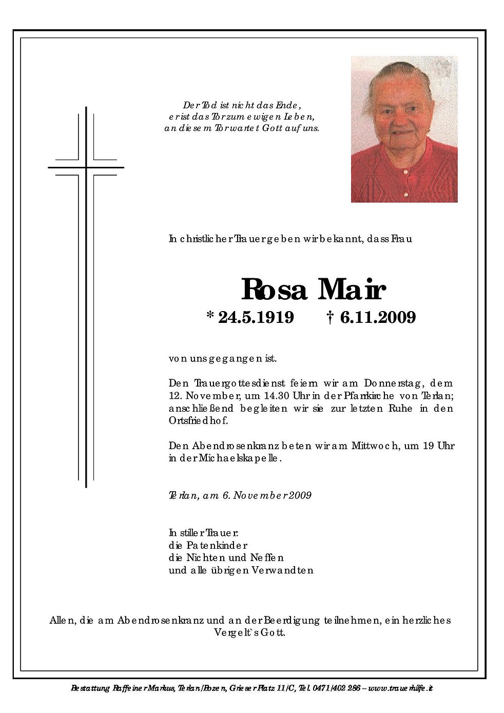 Den Trauergottesdienst feiern wir am Donnerstag, dem 12. November, um 14.30 Uhr in der Pfarrkirche von Terlan; anschließend begleiten wir sie zur letzten Ruhe in den Ortsfriedhof.