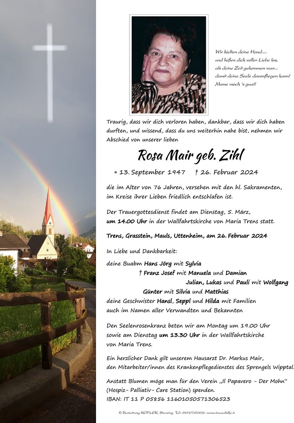 Anstatt Blumen möge man für den Verein „Il Papavero - Der Mohn“ (Hospiz- Palliativ- Care Station) spenden. IBAN: IT 11 P 05856 11601050571306523