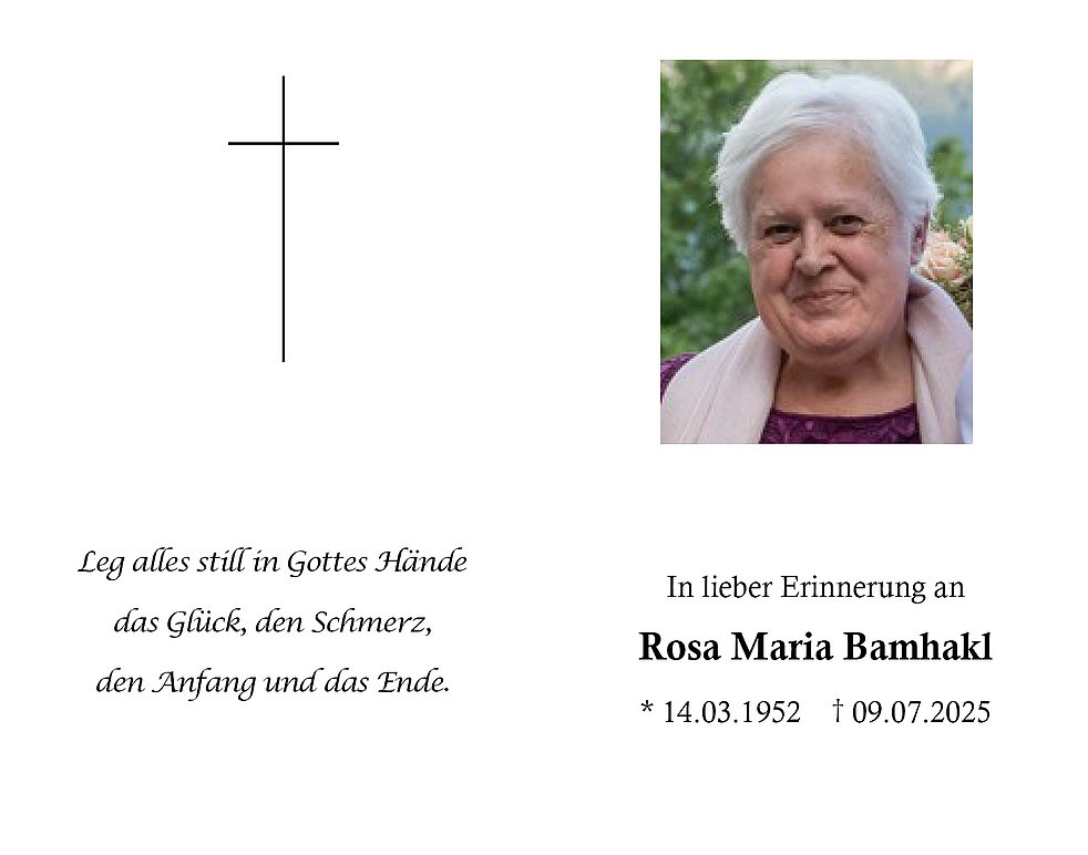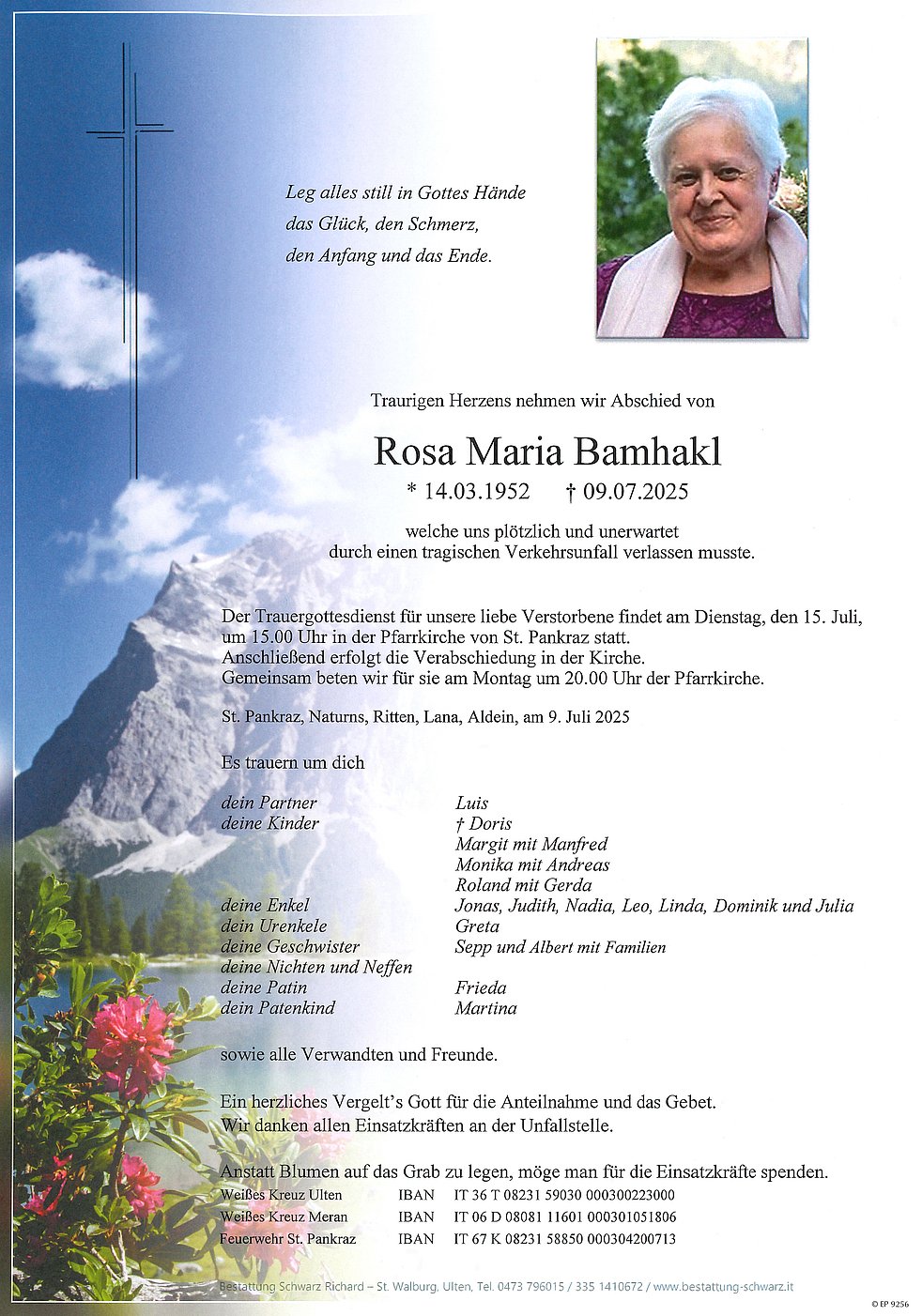 Der Trauergottesdienst für unsere liebe Verstorbene findet am Dienstag, den 15. Juli, um 15.00 Uhr in der Pfarrkirche von St. Pankraz statt.